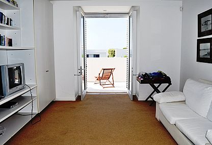 Bedroom 3: Back facing. King size/Twin beds. Bathroom is shared with bedroom 4. 2 lamps. 2 bedside tables. Doors open onto small balcony shared with bedroom 4.