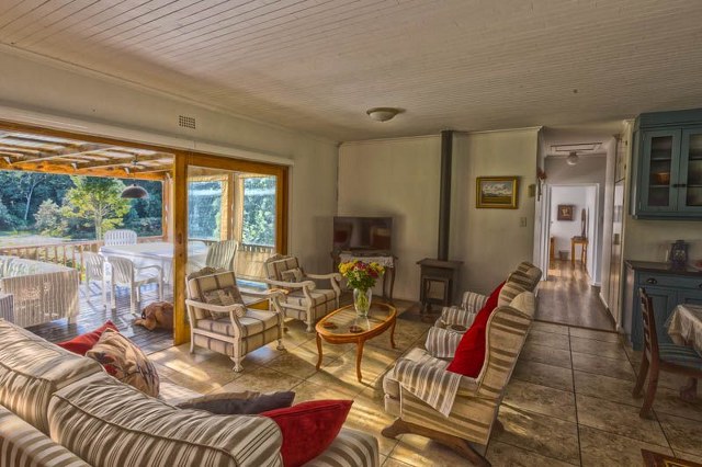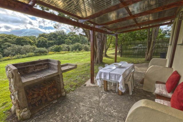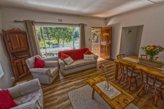 Sleeps 5. Main bedroom with double bed. Second bedroom with bunk beds. Single bed in lounge. Retro bathroom with ball and claw bath plus outdoor, open-air shower next to the river. Open-plan living area consisting of well-equipped kitchen, comfortable lounge with TV, indoor fireplace and dining table. Opens onto a quaint undercover patio with seating arrangements and outdoor braai. River/stream and forest views.