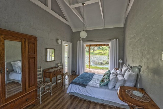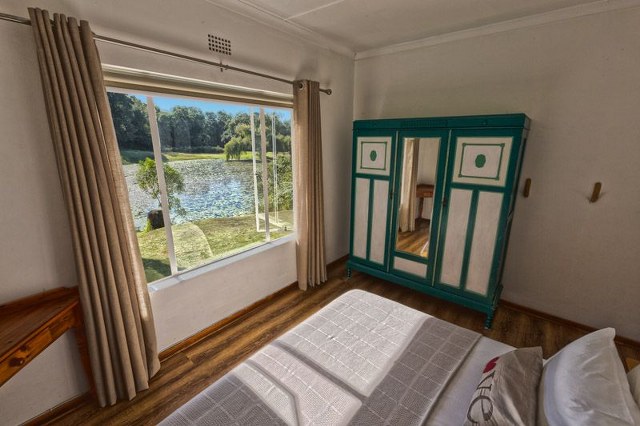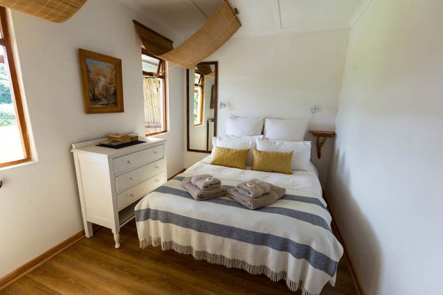 Sleeps 7. Two bedrooms, both with Queen size beds, one with additional bunk beds. Single bed in lounge. Bathroom with shower only. Separate toilet. Comfortable lounge with TV, indoor fireplace, dining table and chairs. Fully equipped kitchen. Undercover patio with seating arrangements. Outdoor braai. Dam and forest views.