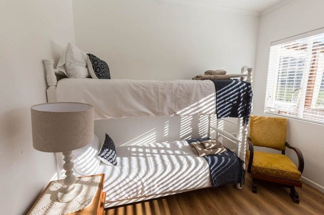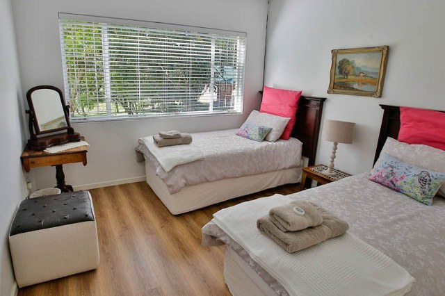 Sleeps 8. Four bedrooms. One with Queen size bed, another with twin beds, a third with Queen size bed and ensuite bathroom, and the fourth room with a double bunk bed. Separate bathroom with shower only. Lounge with indoor fireplace and TV, dining table and fully equipped kitchen with scullery. Open-plan living areas opens onto spacious, protected deck with comfortable couches, dining table. Dam and forest views.