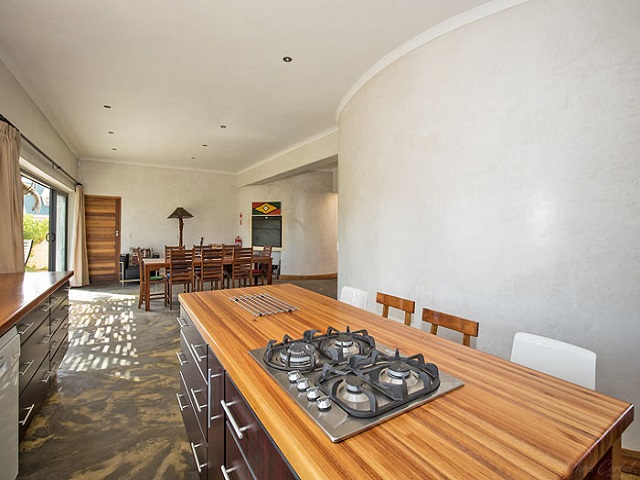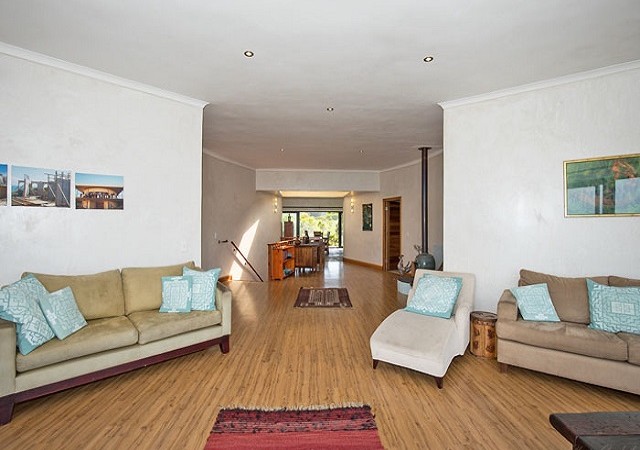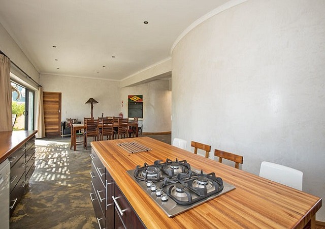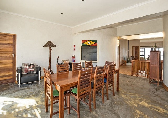Dining – Long dining table seating 8 people. Indoor BBQ/Braai. Sliding doors open onto garden. Garden views and distant sea views.