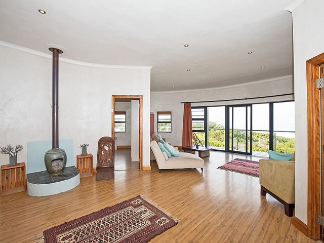 Lounge – Open plan with comfortable sofas. Flatscreen TV with full package DStv and DVD Player. Indoor fireplace. Selection of reading material, DVDs and board games. Sliding doors open onto wrap-around balcony. Sea views.
