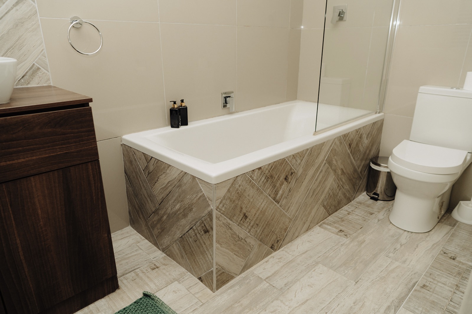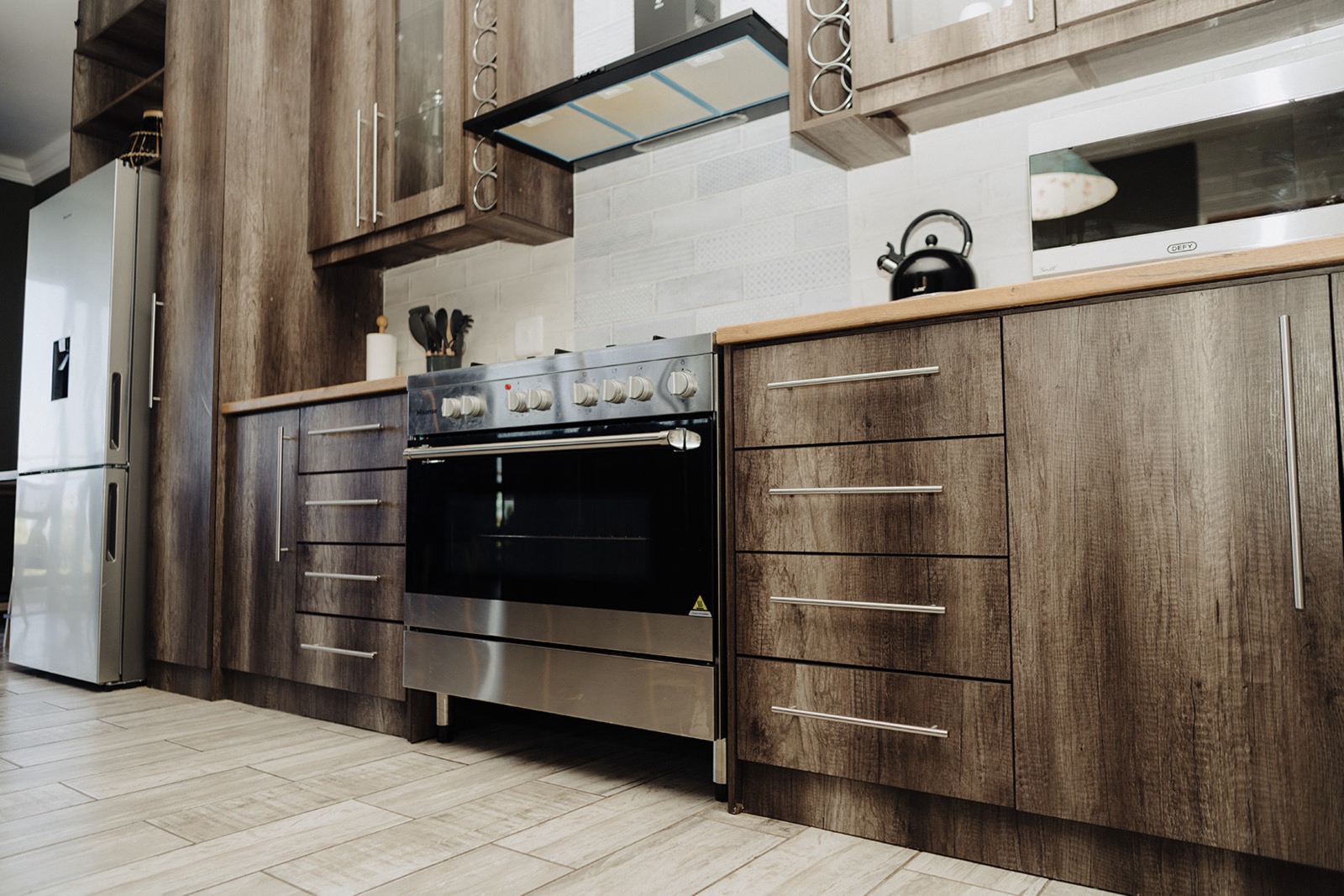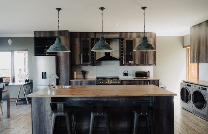 Kitchen – Fully equipped for self-catering purposes with all the mod cons including a gas stove top, electric oven, large fridge/freezer, microwave, airfryer, coffee machine, washing machine, dishwasher and tumble dryer. Island with bar chairs. Door opens onto outside undercover area with washing line.