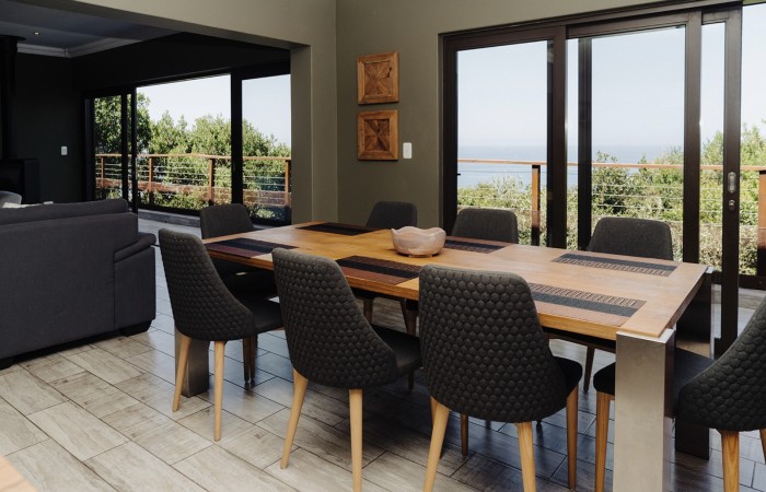 Dining Area – Seats 8. Desk in corner. Sliding doors open onto front sea and forest-facing balcony. Tranquil forest and partial sea views.