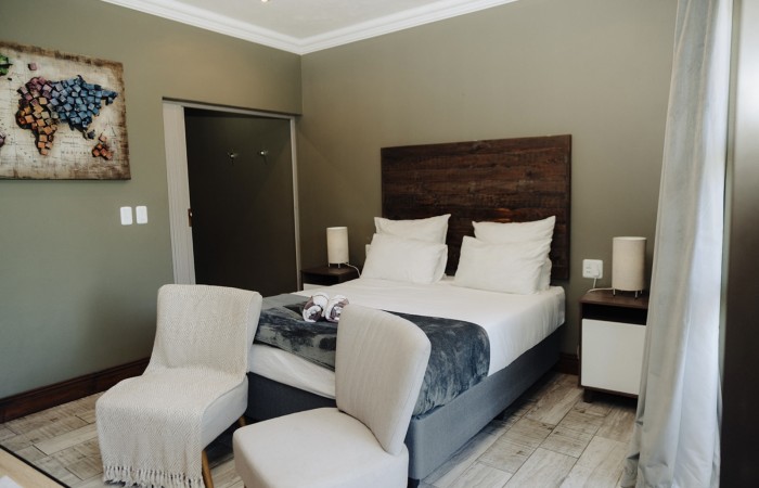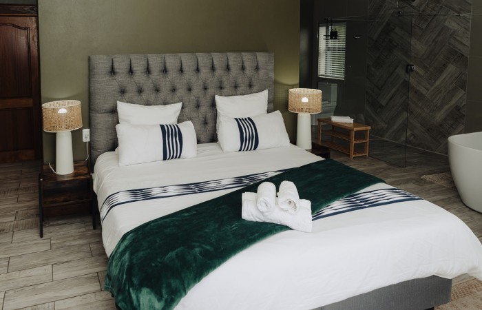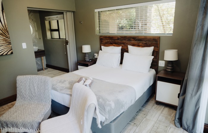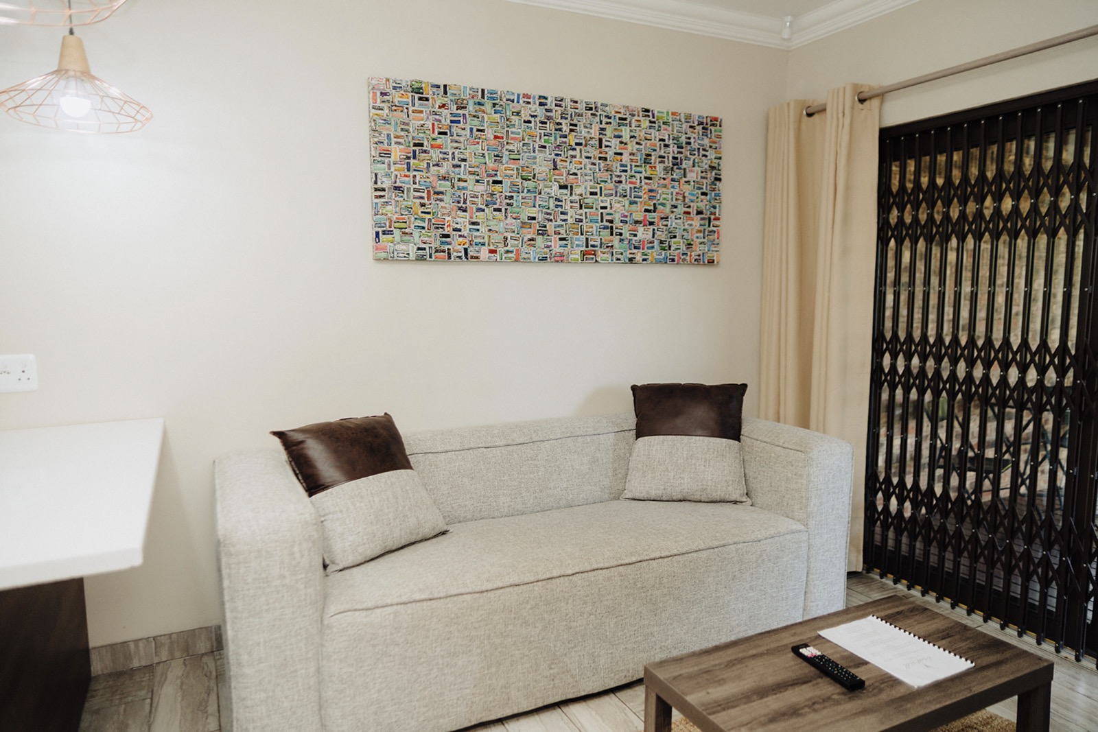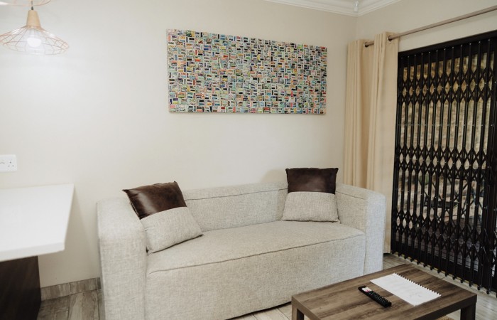 Bedroom 5: Queen size bed. L-shaped couch. Smart flatscreeen TV. To share bathroom with one of the other rooms. Access via the main house.