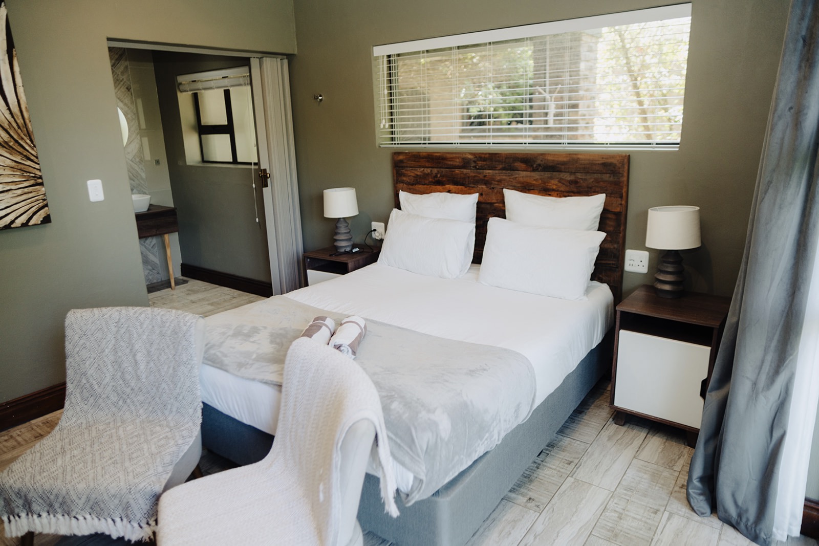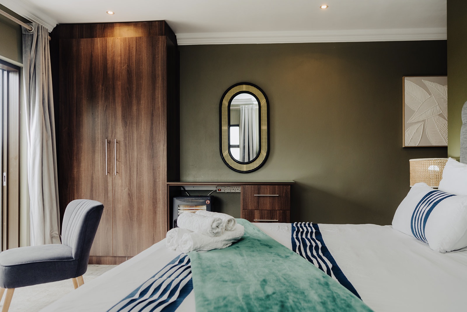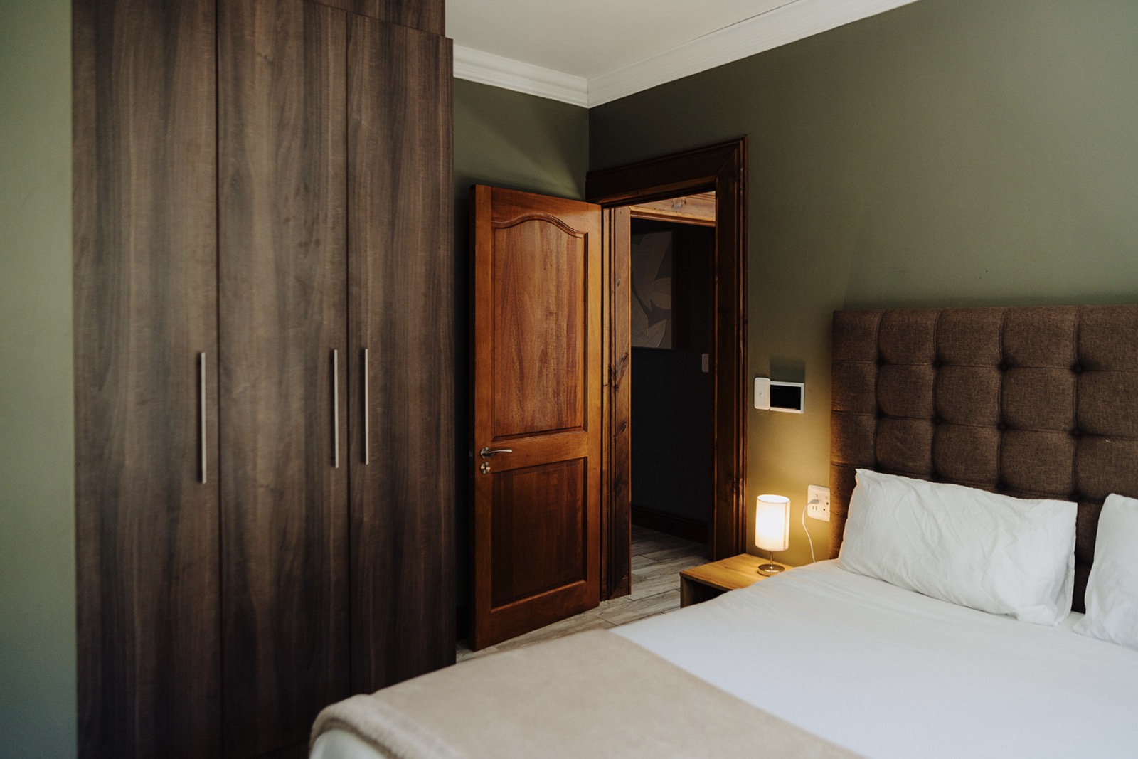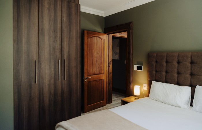 Bedroom 2: Queen size bed. Ample built-in cupboards. Open-plan bathroom with walk-in shower. Garden views.