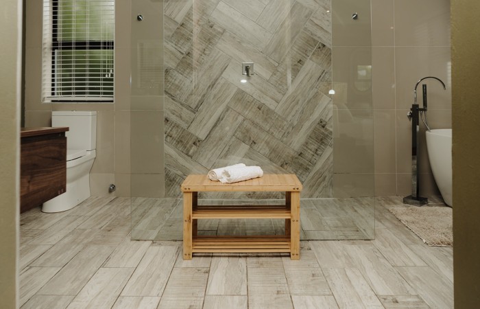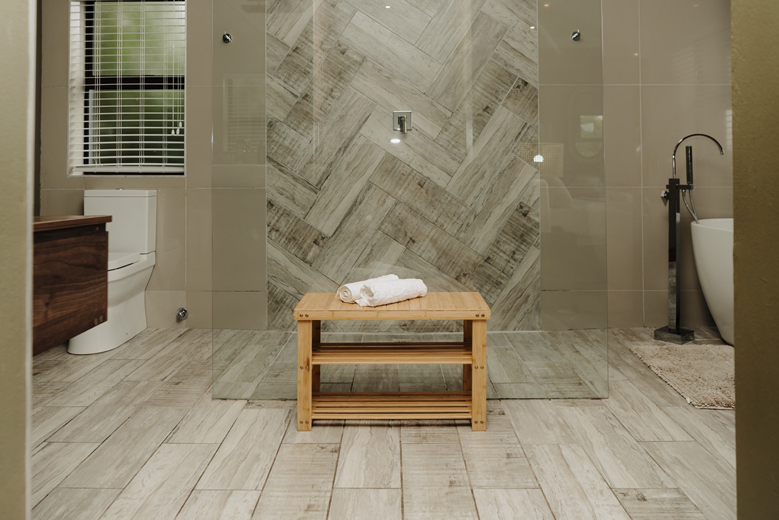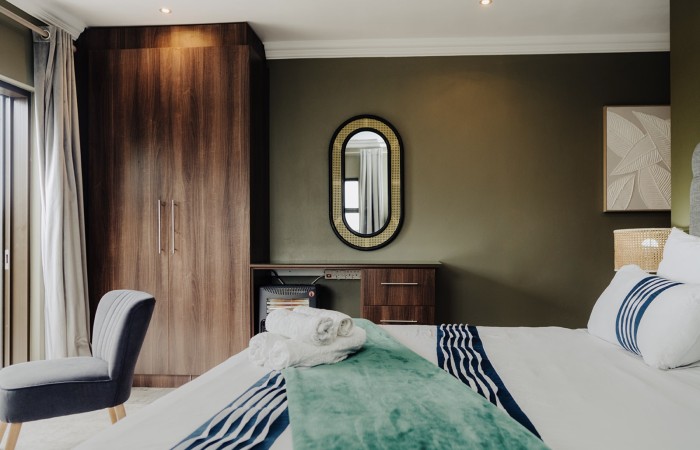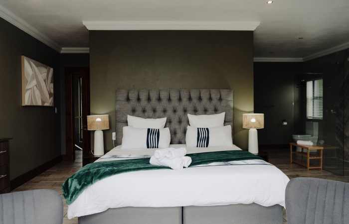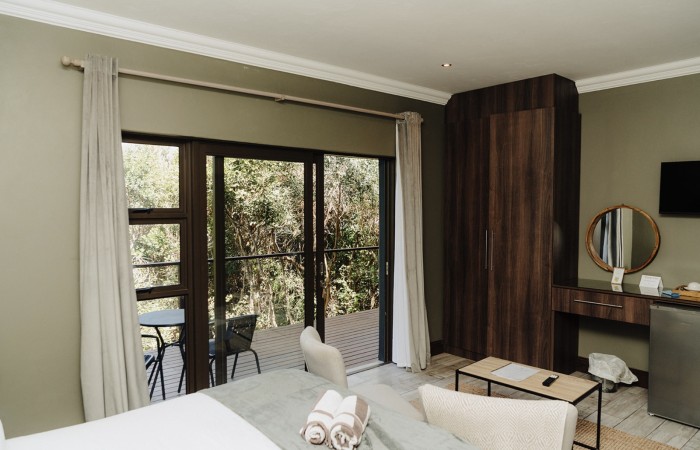 Bedroom 4: Queen size bed. Two single lounge chairs. Smart flatscreeen TV. Mini bar fridge. Microwave. Tea & coffee station. Ample built-in cupboards. Dressing table. En-suite bathroom with walk-in shower. Sliding door opens onto shared sea and forest-facing balcony. Outdoor seating. Tranquil forest and partial sea views. Separate entrance via outside walkway as well as door for direct access into the main house.