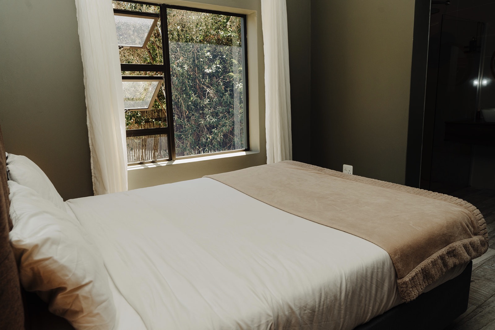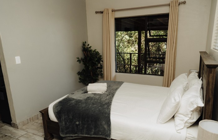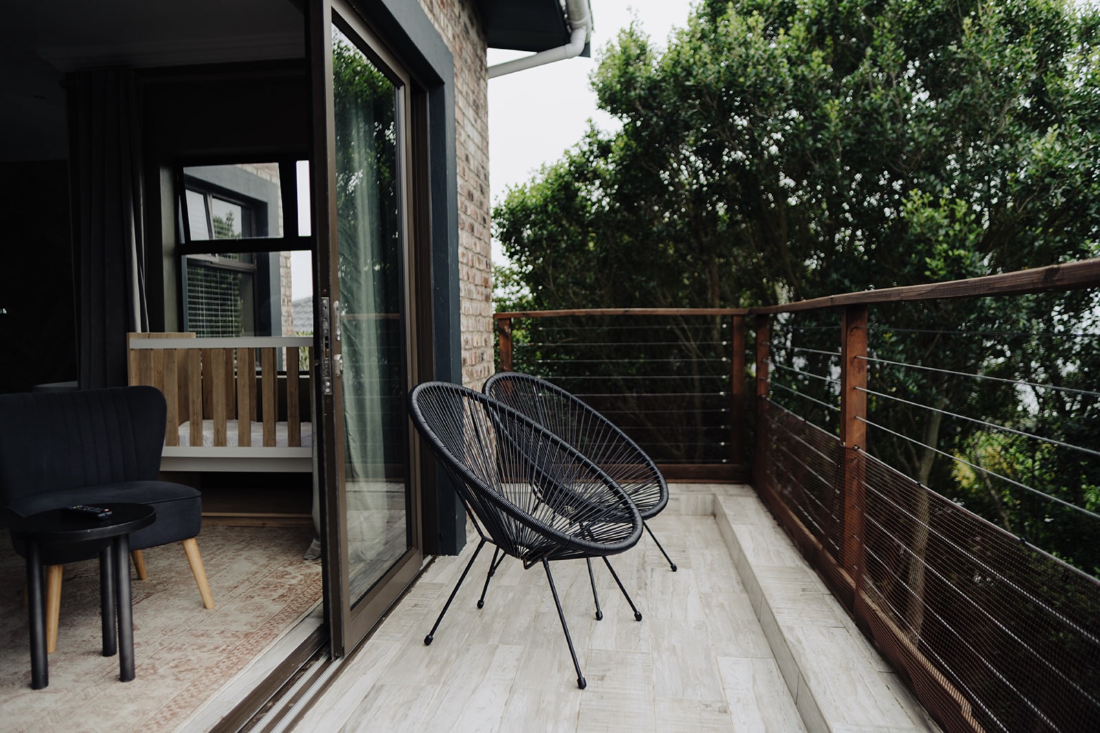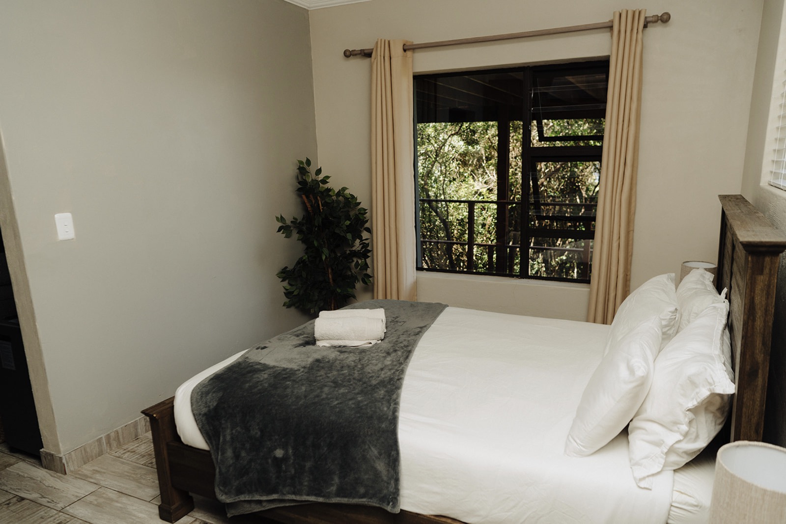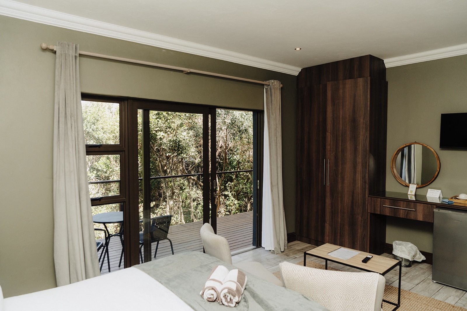 Bedroom 6: Self-contained apartment. Bedroom with Queen size bed. Ample built-in cupboards. Open-plan bathroom with shower over bath. Lounge with comfortable couche and smart flatscreeen TV, open plan with equipped kitchen. Fridge/Freezer combo. Microwave. Air fryer. Washing machine. Electric oven and stove top. Sliding door opens onto sea and forest-facing private undercover balcony. Outdoor seating. Tranquil forest and partial sea views. Separate entrance via outside walkway and is not accessible through the main house.