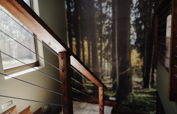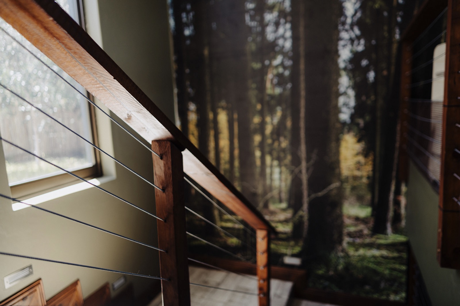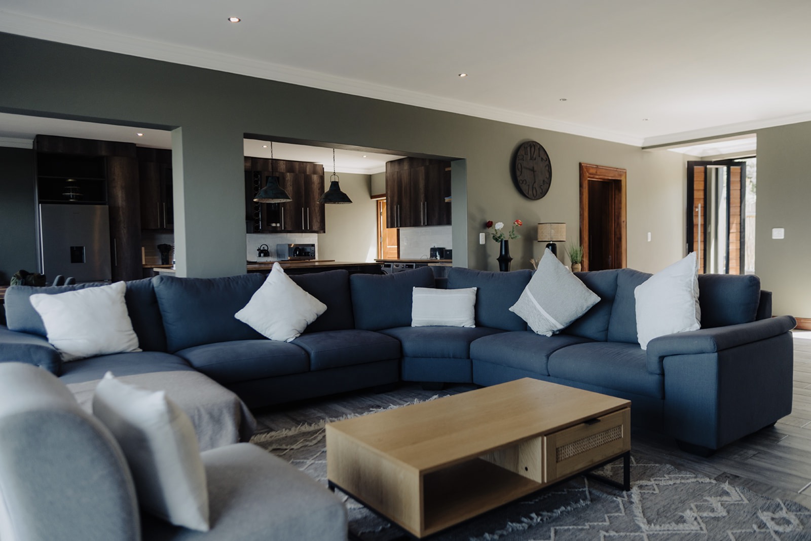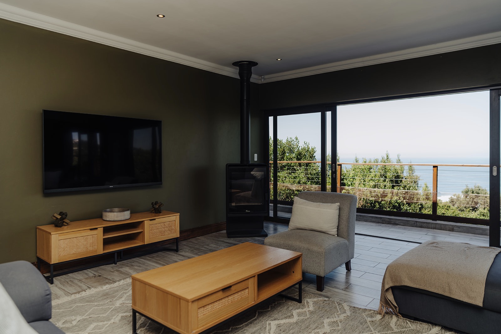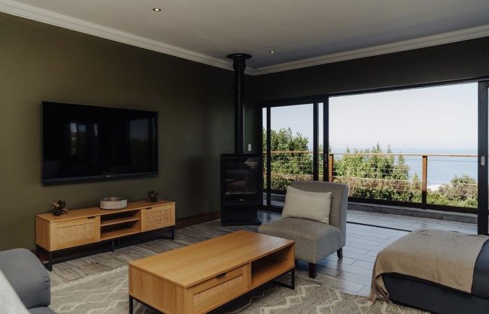 Lounge – Stylish lounge with comfortable couches. Large smart flatscreeen TV. Indoor wood-burning fireplace. Sliding doors open onto front sea and forest-facing balcony. Tranquil forest and partial sea views.