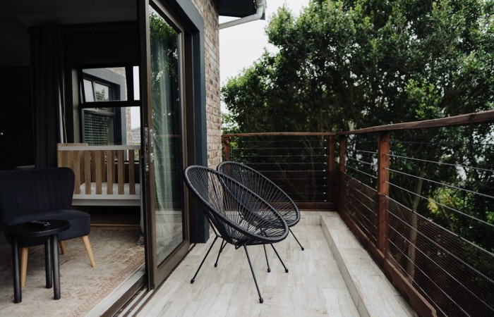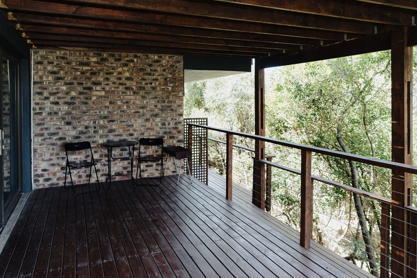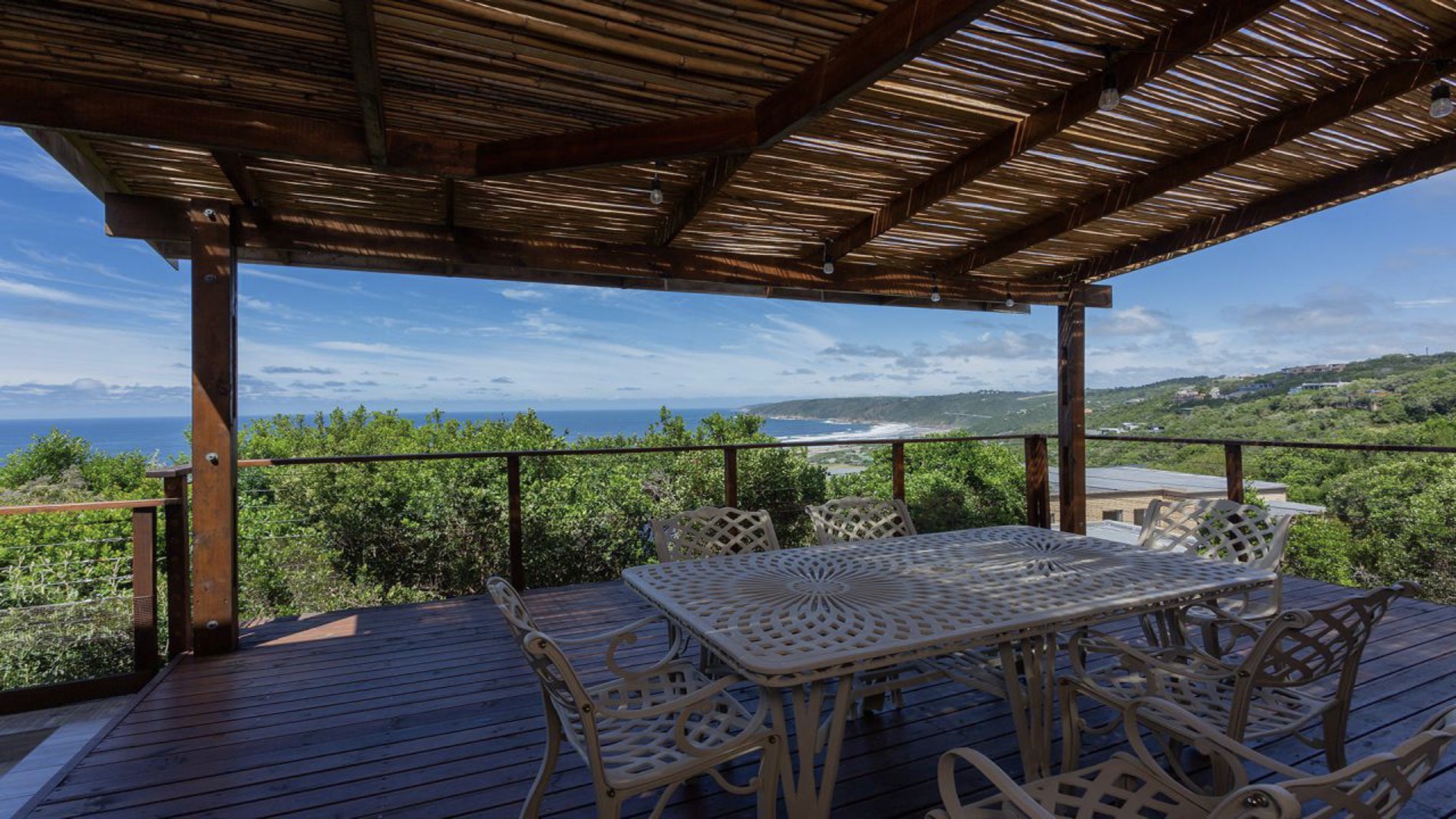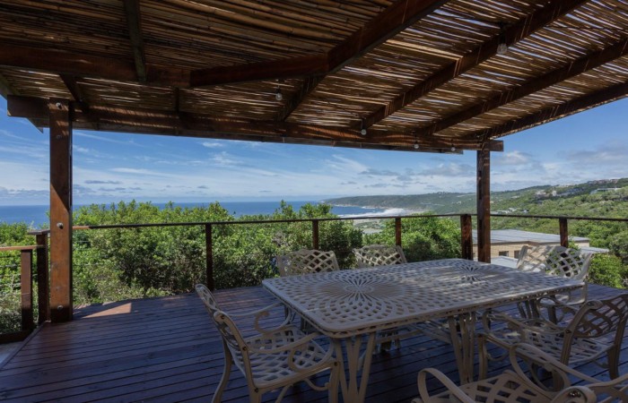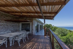 Outside – Spacious sea and forest-facing balcony. Sheltered uncovered balcony with 6-seater dining table. Gas BBQ/Braai. Enclosed garden.