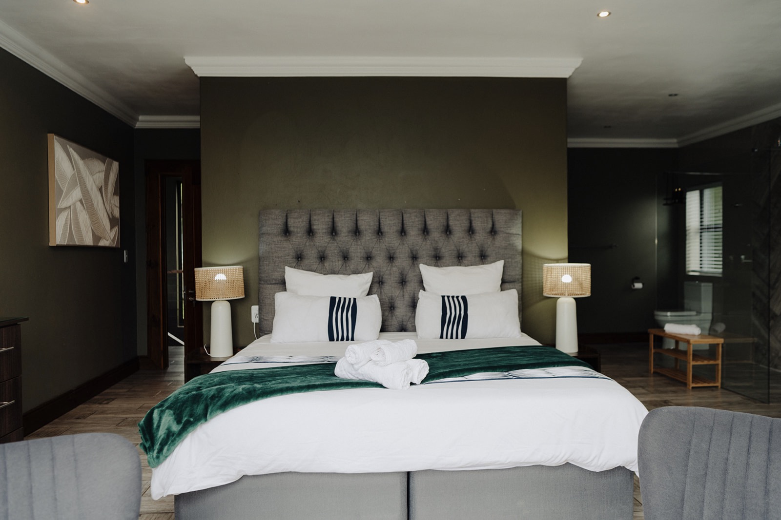 Bedroom 3: Queen size bed. Two single lounge chairs. Smart flatscreeen TV. Mini bar fridge. Microwave. Tea & coffee station. Ample built-in cupboards. Dressing table. En-suite bathroom with walk-in shower. Sliding door opens onto shared sea and forest-facing balcony. Outdoor seating. Tranquil forest and partial sea views. Separate entrance via outside walkway as well as door for direct access into the main house.