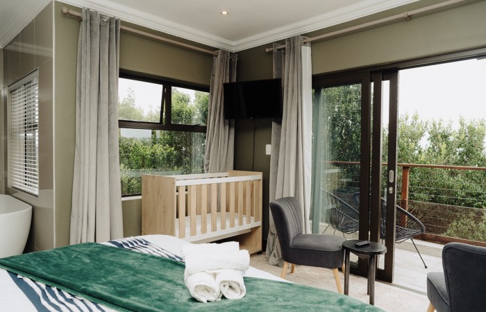 Bedroom 1: King size bed. Two single lounge chairs. Smart flatscreeen TV. Baby cot. Walk in dressing room. Ample built-in cupboards. Dressing table. Open-plan bathroom with double vanities, walk-in shower and free standing bath. Sliding door opens onto sea and forest-facing balcony. Tranquil forest and partial sea views.