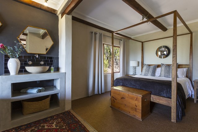 Sandstone Cottage: Four-poster Queen size bed, sleeps max 2. Open-plan Jacuzzi/spa bath with views. En-suite bathroom with shower. Lounge area with wood-burning fireplace. Portable air conditioner. Flatscreen TV with DStv and DVD player. Fully equipped kitchen with couple size dishwasher. Nespresso pod coffee machine. Indoor dining table with chairs. Private balcony with wood burning BBQ/Braai, 2x hammocks and outdoor dining table with chairs. Private courtyard/boma with firepit and seating arrangements.