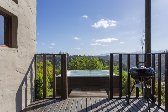 Birdsong Cottage: Queen size bed, sleeps max 2. Open-plan en-suite bathroom with walk-in shower with views and seperate toilet. Air conditioning. Lounge area. Flatscreen TV with DStv. Fully equipped kitchen. Nespresso pod coffee machine. Private balcony with jacuzzi, sunloungers, gas Weber BBQ/Braai and outdoor dining table with chairs.