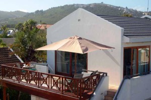 Deck – Full wooden deck across the front of the apartment with sun loungers, parasol, BBQ/braai facilities, table and chairs.