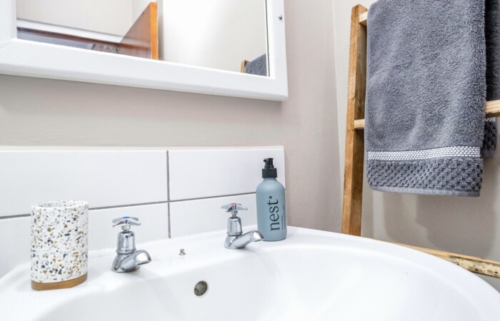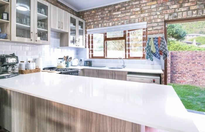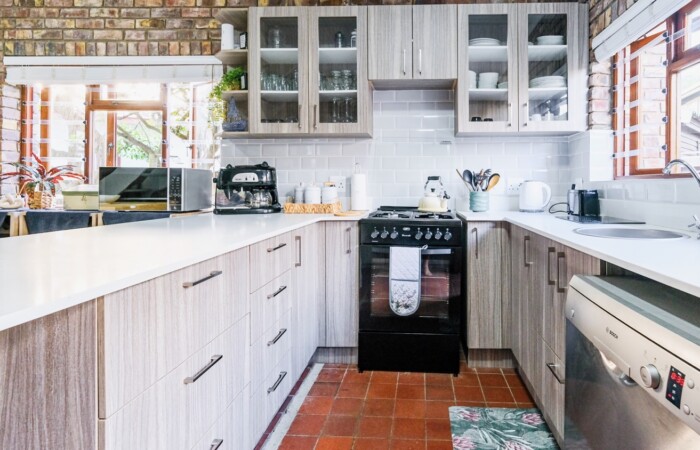 Kitchen – Fully equipped for self-catering purposes with gas stove top/oven, coffee maker, microwave, kettle, dishwasher and fridge/freezer. Additional stand-alone deep freezer. The door opens onto the outside garden with 2 washing lines. Washing machine in the garage.