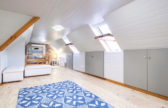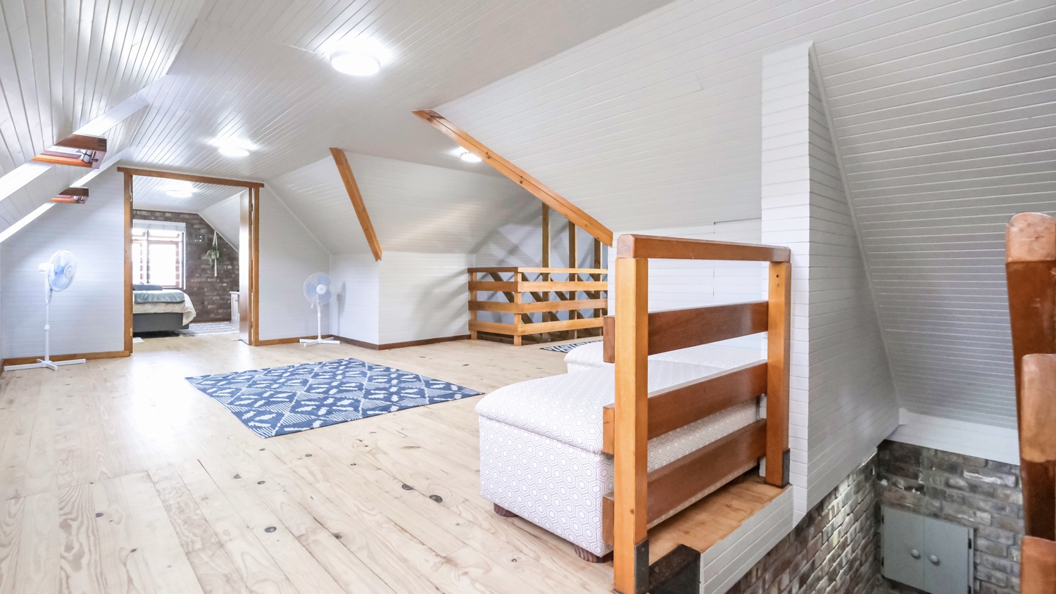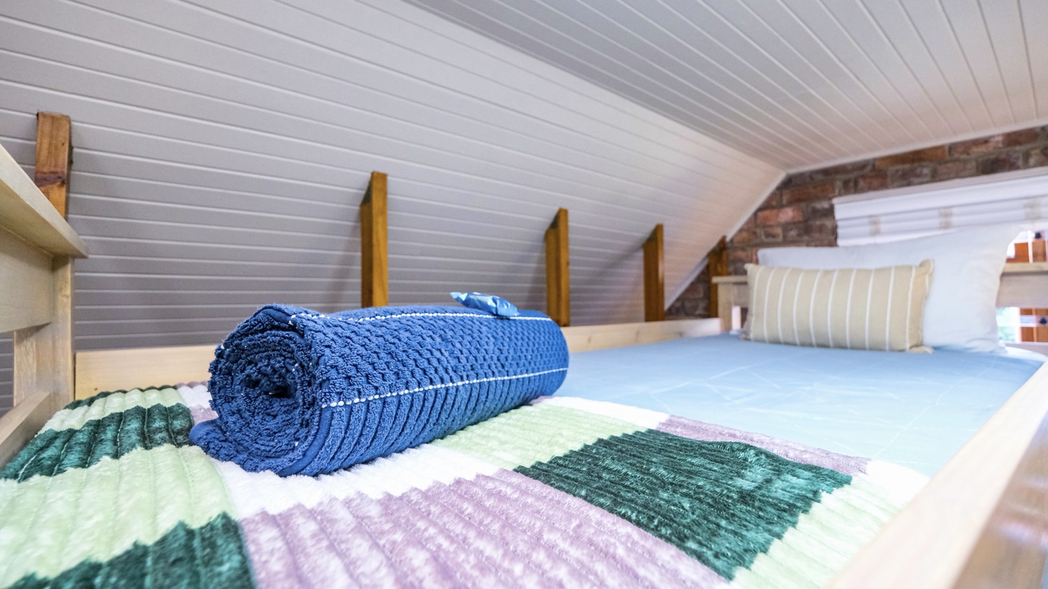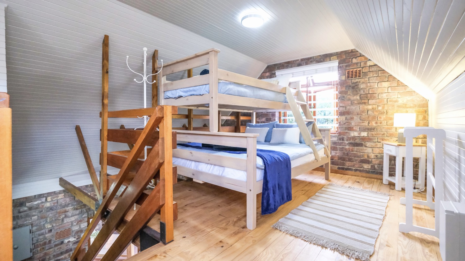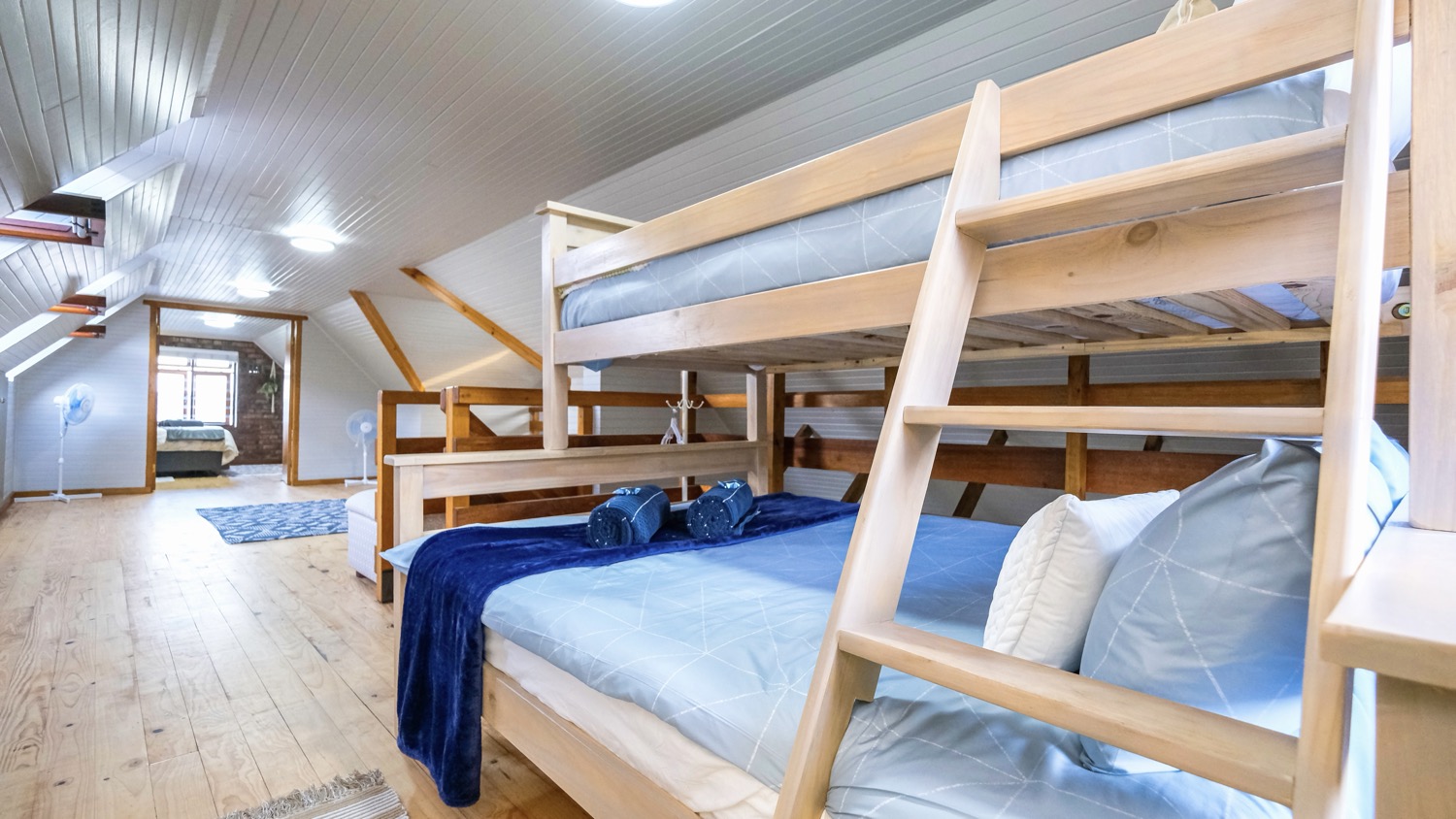 Loft: Tri-bunk bed (double at bottom and single on top). Garden views.