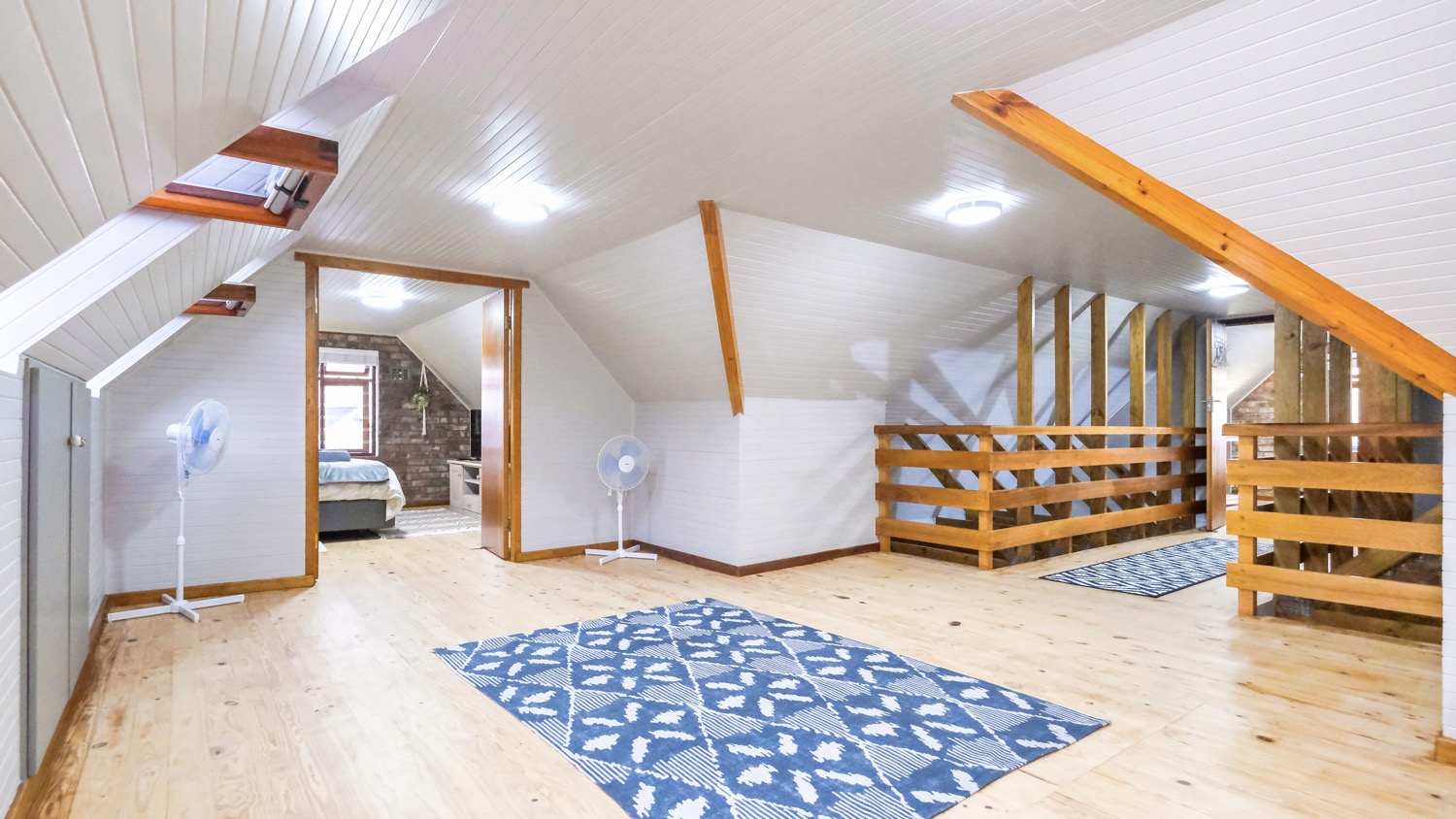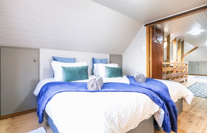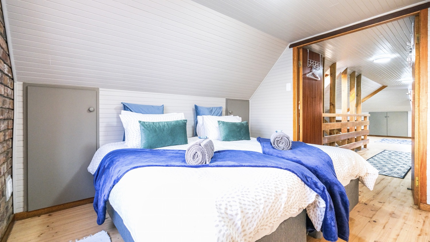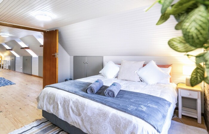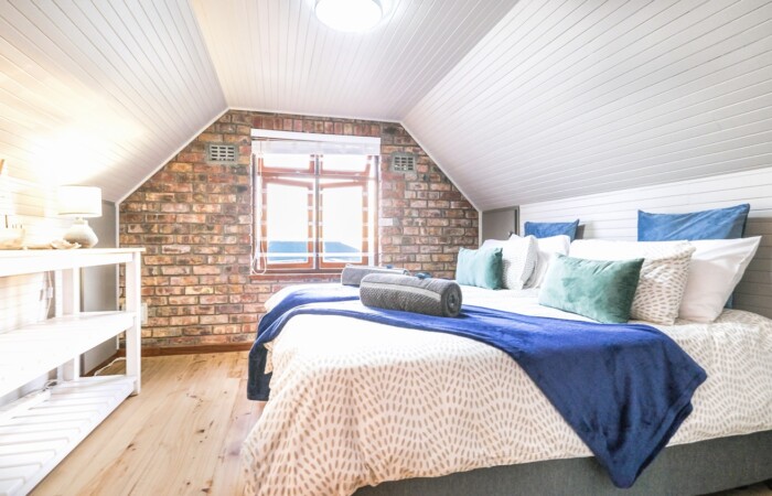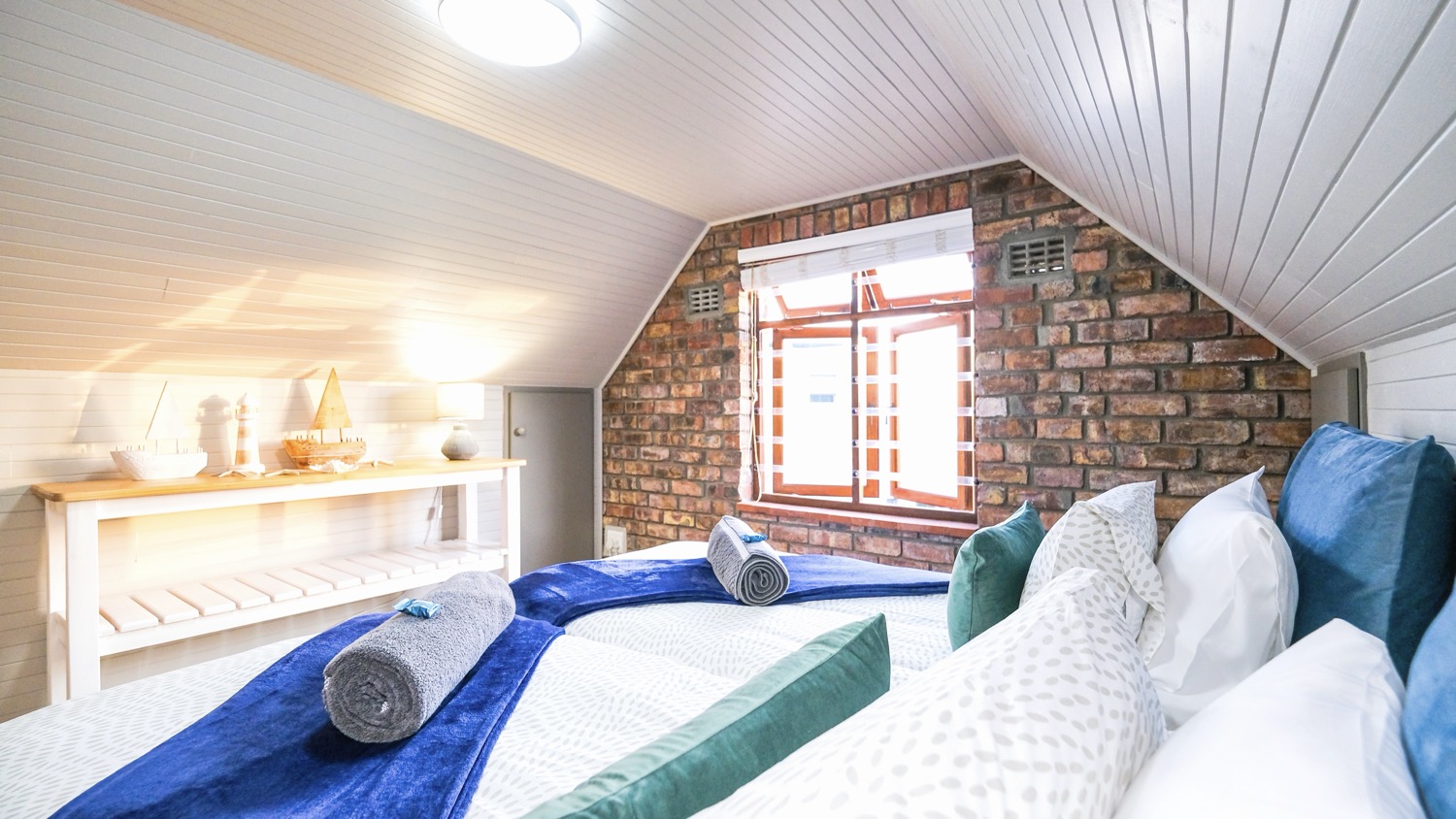 On the top level are two private bedrooms, both with sea views, and a tri-bunk bed, all of which occupy this open-plan loft area. Downstairs is the third bedroom, which is en-suite, a spacious lounge with a flatscreen TV, two indoor/outdoor living areas both with built-in BBQ/Braai, a well-equipped kitchen with a dining table, a full bathroom, plus an additional guest toilet.