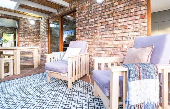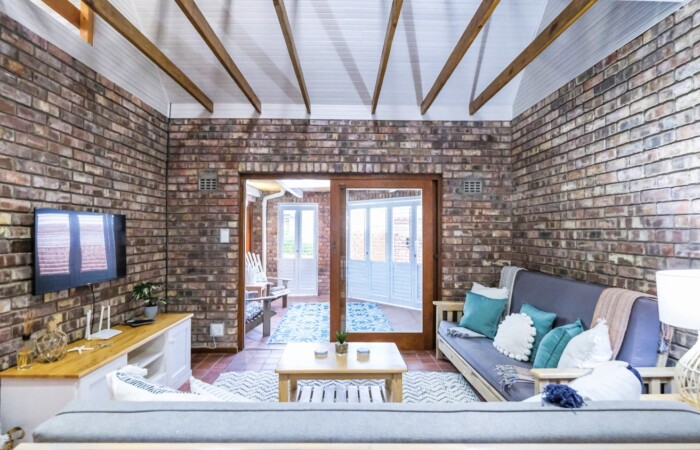 Lounge – Comfortable seating arrangements. Wall-mounted flatscreen TV with full DSTV package. Sliding doors open onto either side of the garden-facing indoor/outdoor living areas.
