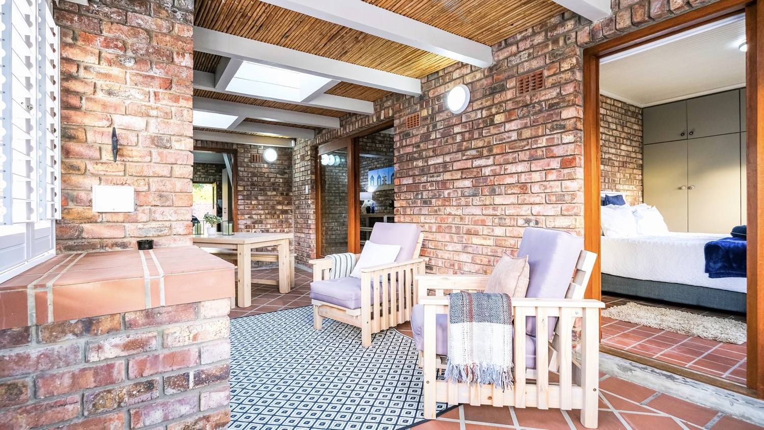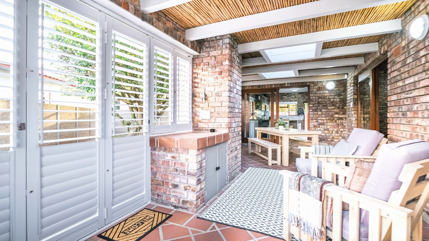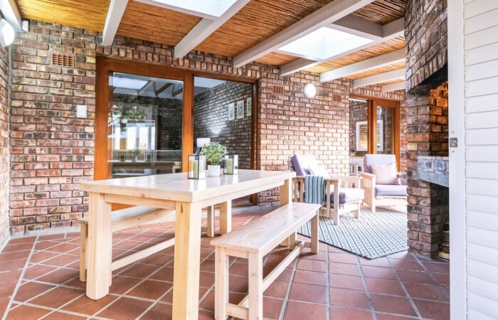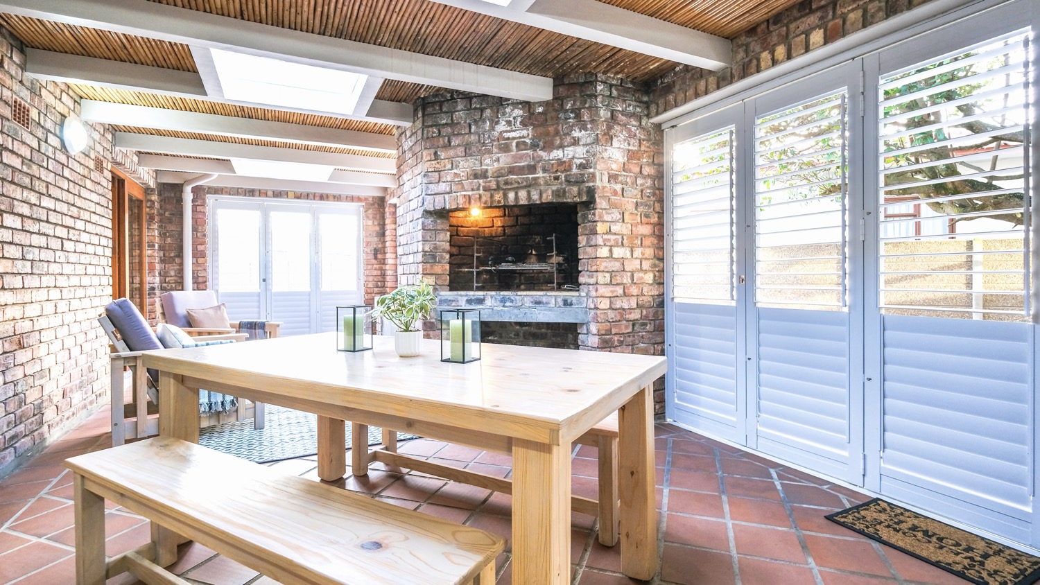 Indoor/Outdoor Living Areas – Two areas on opposite sides of the house, both with built-in BBQ/Braais and seating arrangements. Skylights. Shutters open to allow for an indoor/outdoor living feel. Garden views.