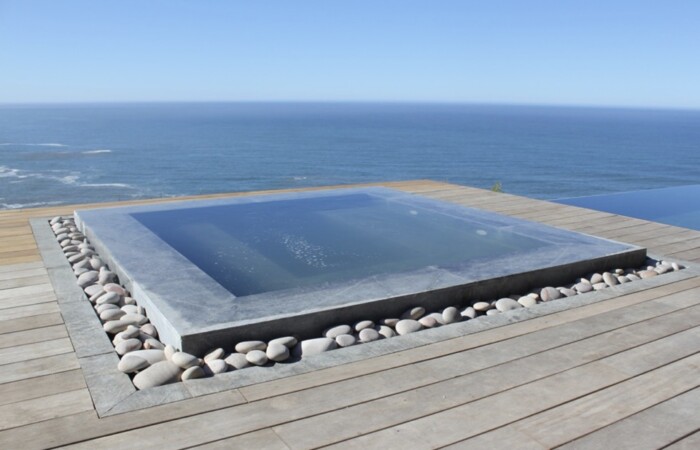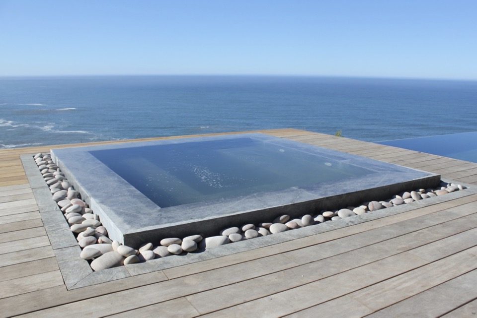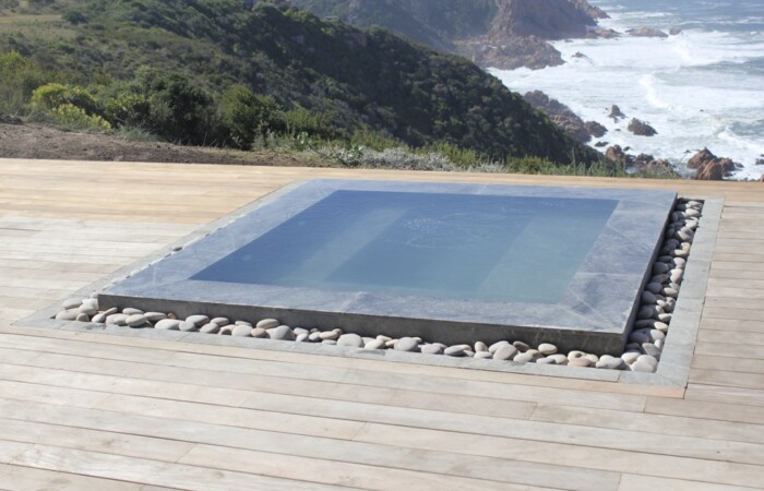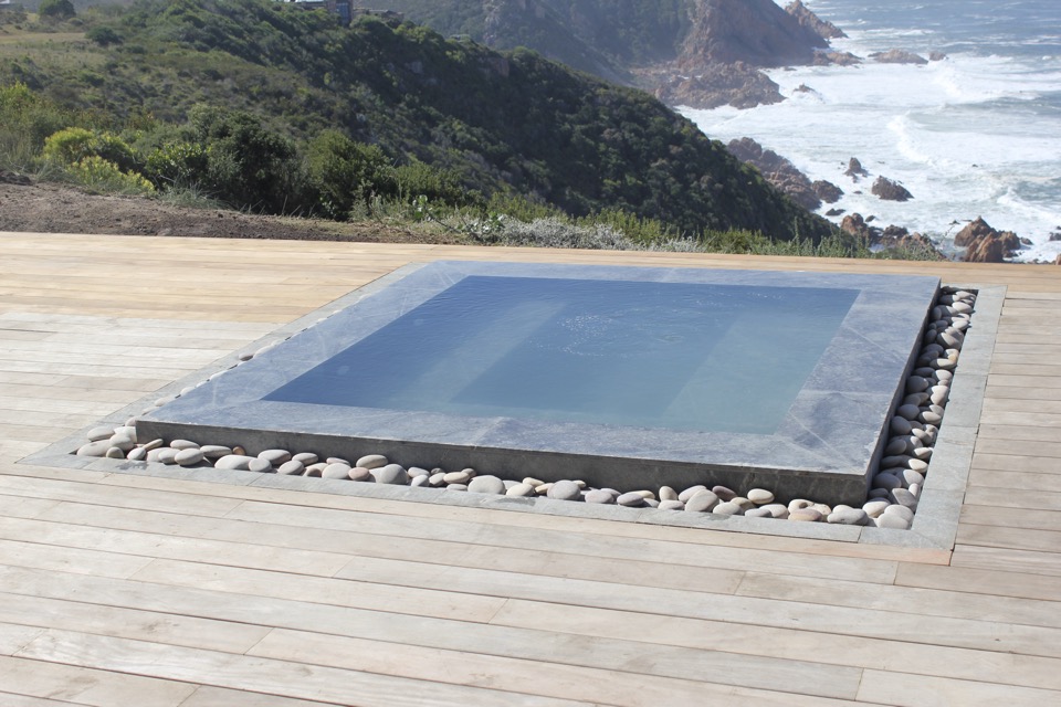 Outside Areas – 36m Infinity swimming pool with sun loungers. Heated Jacuzzi. Viewing sundeck. Portable Weber BBQ/braai. Various outdoor seating arrangements. Landscaped gardens. Pathway down to the private beach.