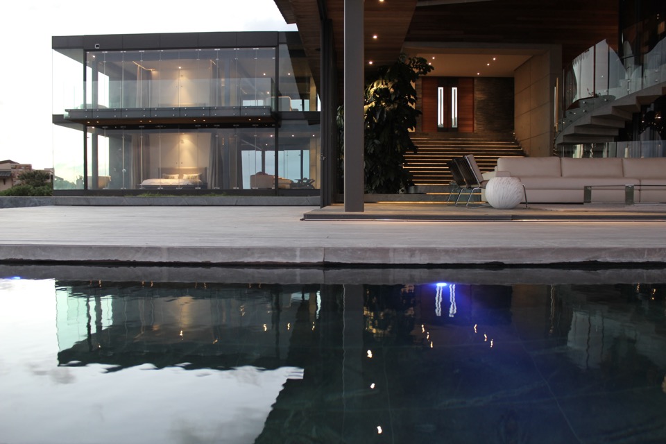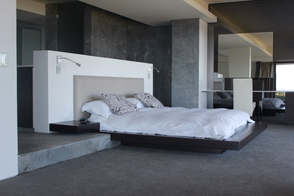 The grand entrance opens to stairs which lead down into an airy open-plan living space, comprising a lounge with an indoor gas fireplace which flows into the formal indoor dining area. Large glass stacking doors open out onto the pool and jacuzzi deck, with large windows above with allow for magnificent and seamless views over the vast Indian Ocean. Also on this floor is a TV lounge with full surround sound and an indoor fireplace plus a writing desk, a contemporary breakfast bar, as well as a fully equipped kitchen with all the mod cons including a seperate scullery.