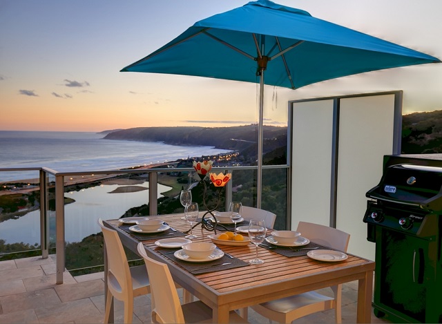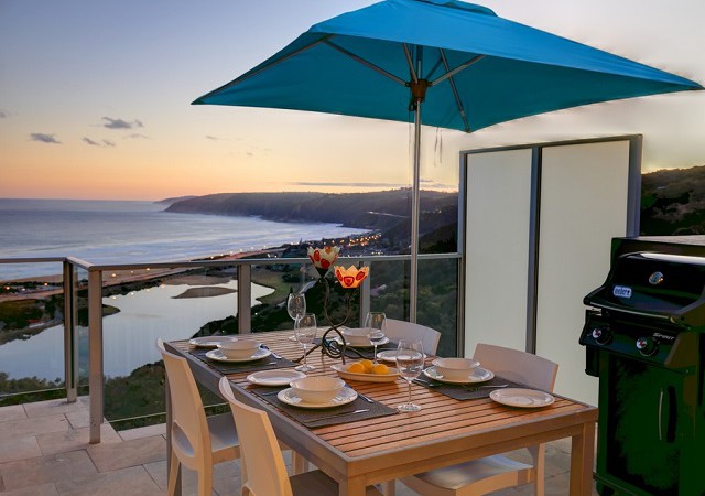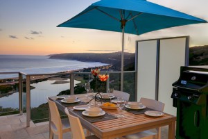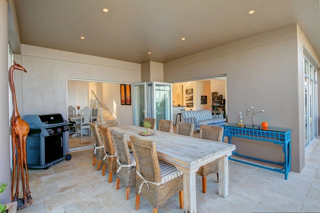 Outdoors – Wrap around balcony. Dining table seating 6. Umbrella. Weber gas BBQ/braai. Sea facing.