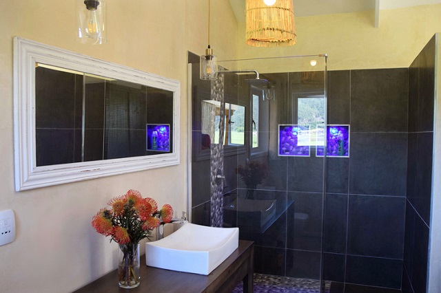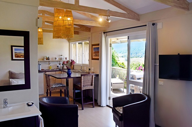 Loerie Cottage: Boutique Cottage. Open-plan. King size bed, bathroom with walk-in shower. Kitchenette with microwave, bar fridge and 2 plate stove. Dining table seating two. Built-in cupboards. Wifi. Flatscreen TV with DStv. Air-conditioning and heater combo. Opens onto undercover deck with sunloungers and dining table seating two. Portable Weber BBQ/Braai. Mountain, Vlei and Lake views. NOTE: Access via 45 stairs.