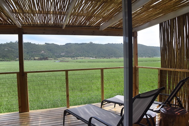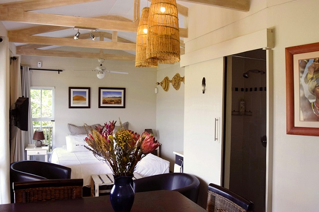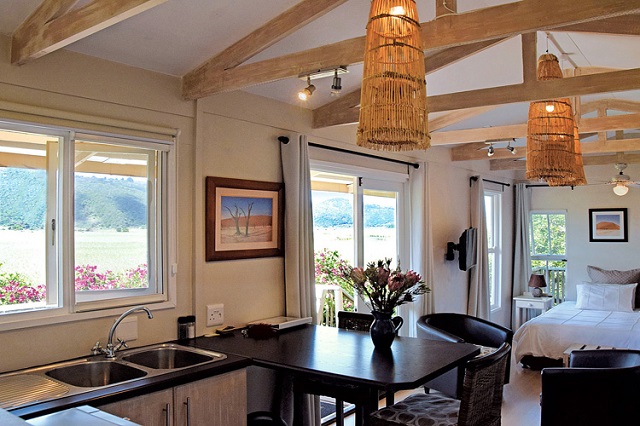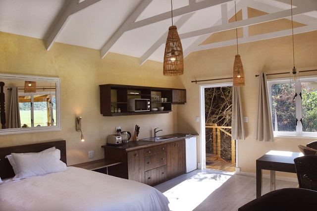 Kingfisher Cottage: Boutique Cottage. Open-plan. King size bed, bathroom with walk-in shower. Kitchenette with microwave, bar fridge and 2 plate stove. Dining table seating two. Built-in cupboards. Wifi. Flatscreen TV with DStv. Air-conditioning and heater combo. Opens onto undercover deck with sunloungers and dining table seating two. Portable Weber BBQ/Braai. Mountain, Vlei and Lake views. NOTE: Access via 30 stairs.
