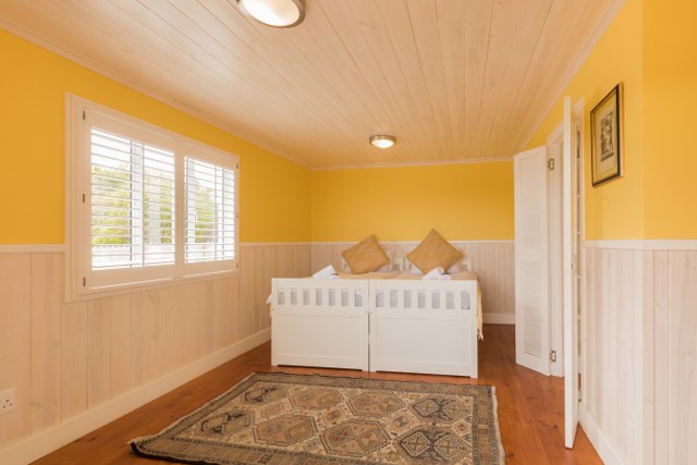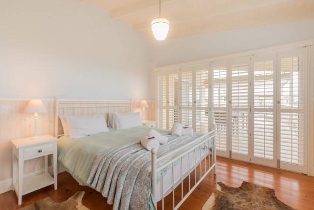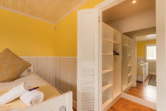 Bedroom 3: Twin beds pushed together. Two single pull-out beds. Walk-in cupboards. Sliding door opens onto garden and private deck.