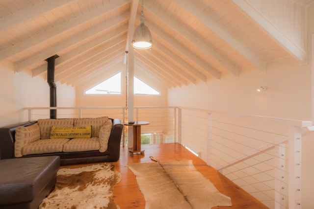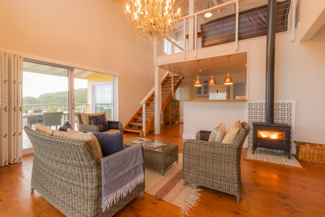Lounge – Downstairs. Open plan with comfortable sofas. Indoor fireplace. Sliding doors open onto wrap-around deck with jacuzzi.