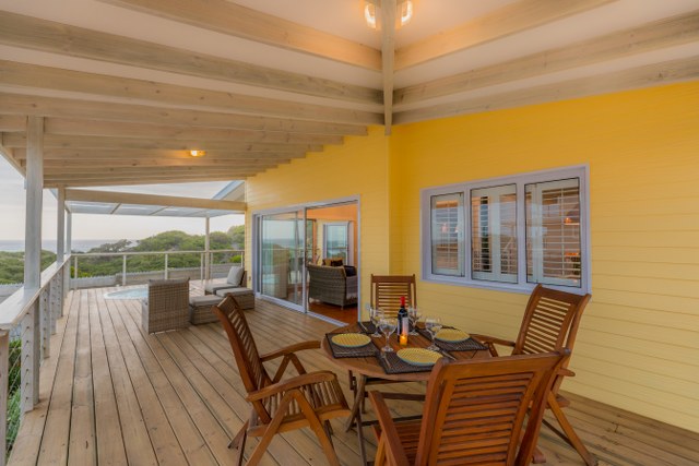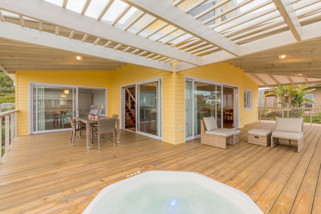 Outdoors – Fully enclosed garden. Sea-facing undercover deck with two dining tables, couches and jacuzzi. Weber BBQ/Braai. Outside store room. Outdoor shower.