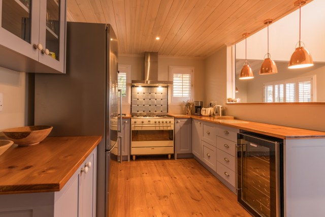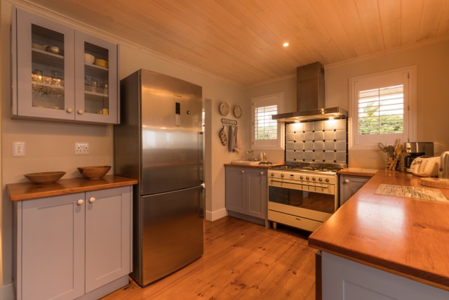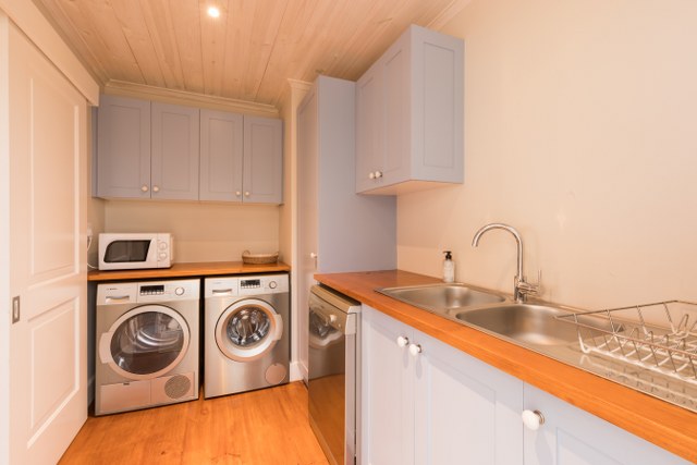 Kitchen – Downstairs. Fully equipped with all the mod cons. Stove with gas top and electric oven, fridge/freezer and wine cooler. Scullery with washing machine, tumble dryer and dishwasher.