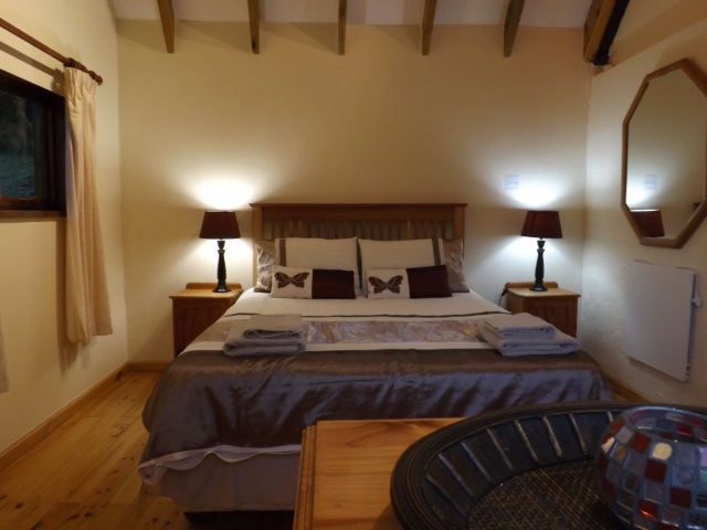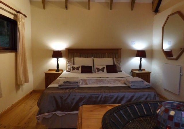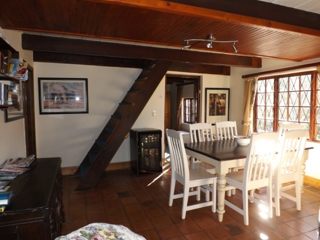 Haven Cottage: Free-standing, double-storey unit that sleeps 5. Ground floor: Main bedroom with Queen size bed and views. Separate bathroom with shower only. Fully equipped kitchen with gas cooker, fridge/freezer and microwave. Lounge area with flat screen TV, DStv, DVD player, double sleeper couch, leads onto sunny deck. Small dining area under stairs. Top Floor ‘Attic’: Second bedroom with Twin beds plus extra mattress for one child. Opens onto veranda with views. Outdoors: Wooden deck with patio furniture and built-in BBQ. Views over dams, gardens and forest. NOTE: Quaint Cottage with low ceilings not ideal for tall people.
