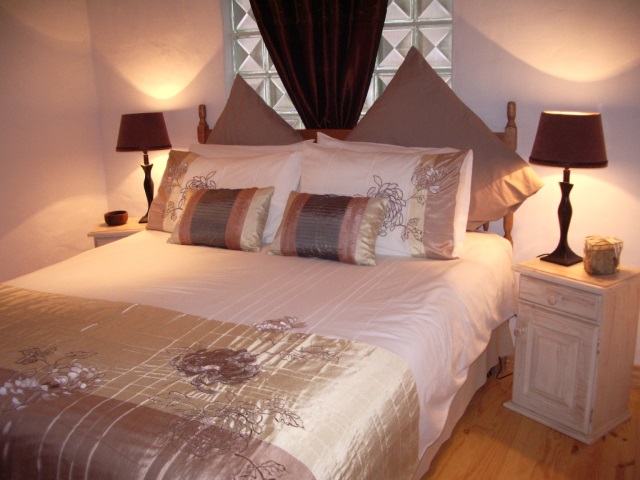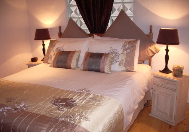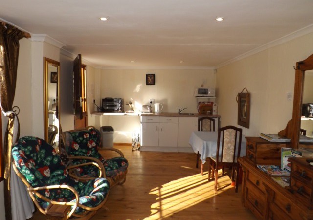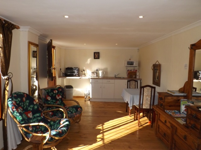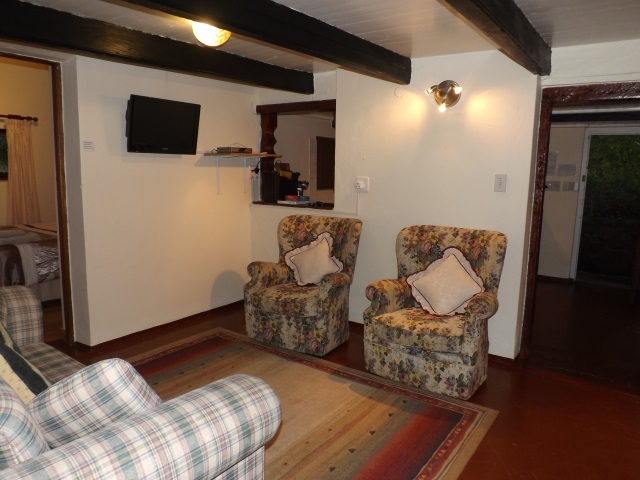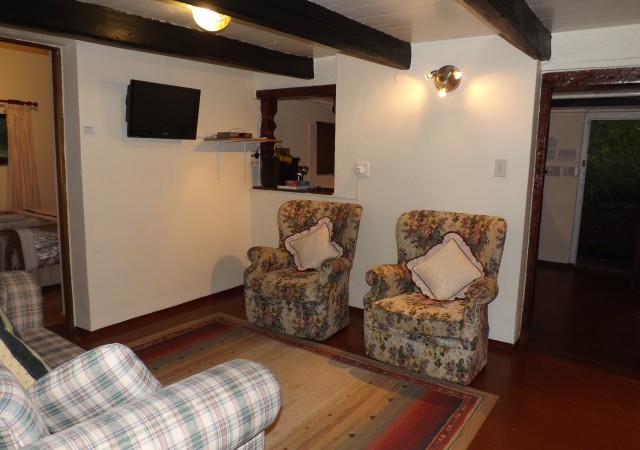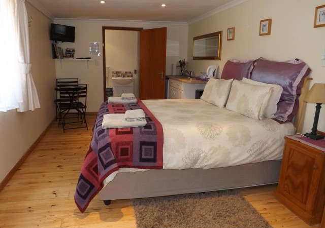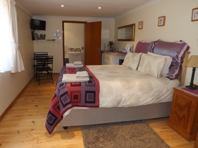 Lavender Room: Self-catering, sleeps 2. Twin beds, en-suite bathroom with shower only. Counter top oven & hotplate, fridge and microwave. Flat screen TV, DStv. Small dining table with two chairs. Opens onto wooden deck with built-in BBQ and sitting/dining area. ‘Budget Room’.