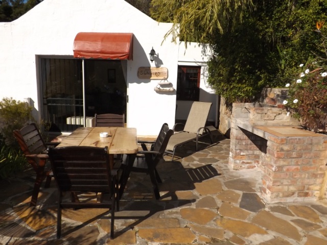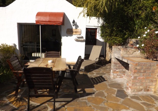 Sunbird Cottage: Free-standing unit, sleeps 4. Bedroom with Queen size bed, en-suite bathroom with shower only. Lounge area with flat screen TV, DStv, DVD player and double sleeper couch. Open-plan with dining area. Sliding doors open outdoors. Fully equipped kitchen with gas cooker, fridge/freezer and microwave. Outdoors: Sun-filled patio with table and chairs. Built-in BBQ. Fully enclosed area. Views over swimming pool and valley. NOTE: Closest unit to the pool.