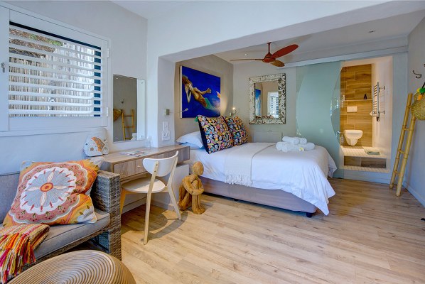 Suite 1: Extra Length Queen bed, bathroom with open-air shower. Indoor lounge area opens onto outside deck with seating arrangements and BBQ/Braai. Lagoon views. Sleeps max 2.
