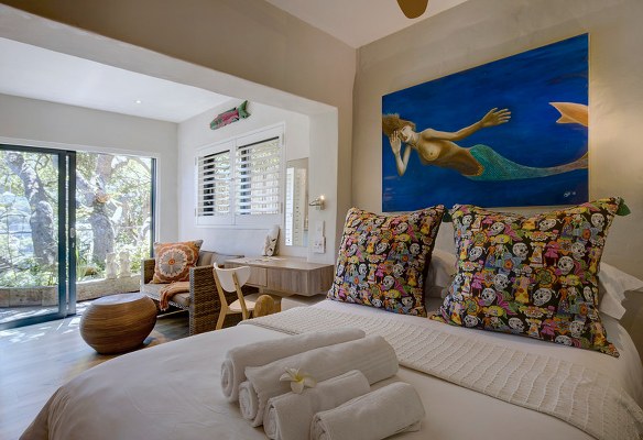 Suite 2: Queen bed, bathroom with open-air shower. Indoor lounge area opens onto outside deck with seating arrangements and BBQ/Braai. Lagoon views. Sleeps max 2.