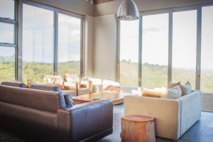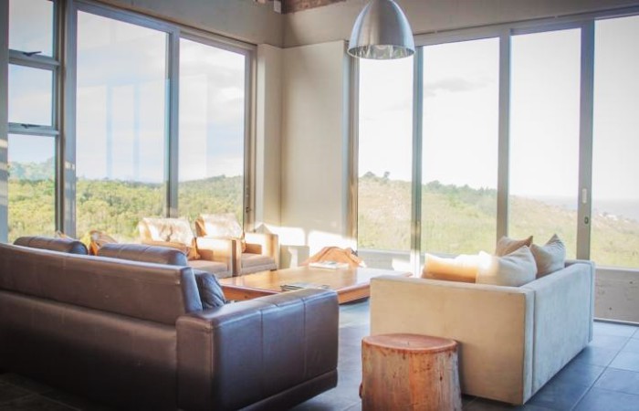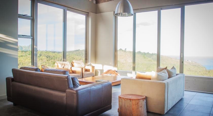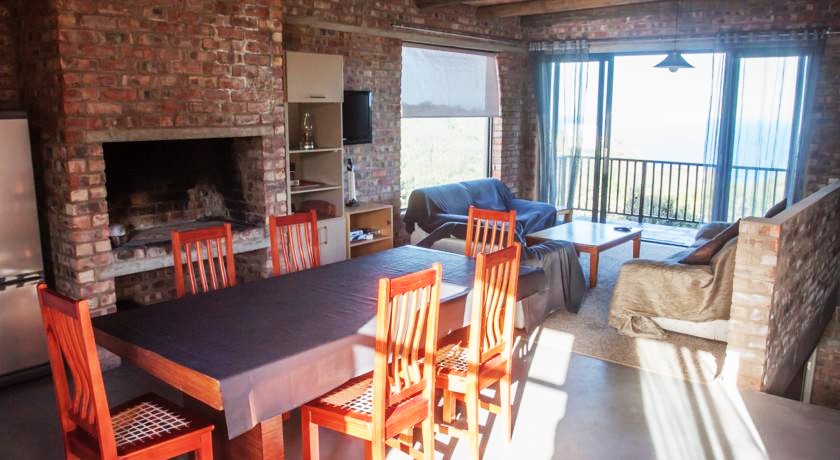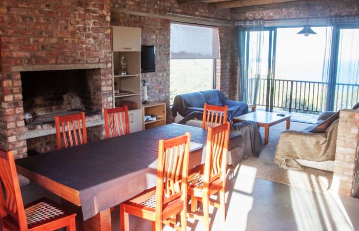 Lounge – Four lounges with comfortable couches, Flatscreen TV with DStv. Main lounge with fireplace and bar area. Doors open onto wrap-around balcony with seating arrangements and sea plus mountain views.