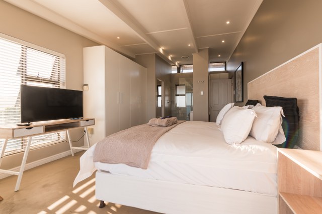 Bedroom 5: King size bed. Ample built-in cupboards. Dressing table. En-suite bathroom with shower. Glass sliding doors opens onto an undercover patio. Garden views.