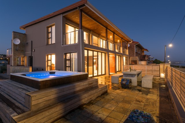 The separate main lounge and dining room, open-plan with the kitchen, both have glass stack sliding doors leading out onto the front sea-facing, wrap-around porch with built-in BBQ/braai and large jacuzzi. Enjoy a sunset social around the fire and soak up endless sea views from the jacuzzi!