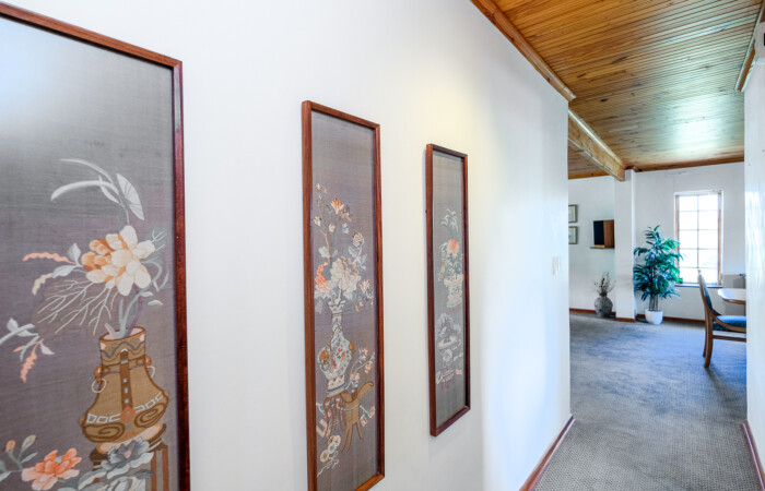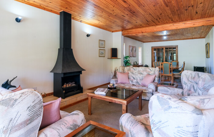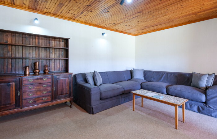 Split on two levels, upstairs comprises the main bedroom which is en-suite and opens onto a private lagoon-facing deck. The lounge, with its cosy indoor gas-burning fireplace, is open-plan with the dining room. Leading off the lounge is a light-filled enclosed sunroom with comfortable seating arrangements and an additional dining table, boasting full lagoon views. There is a separate TV lounge with an indoor gas-burning fireplace, as well as an office nook. The main kitchen is also upstairs and is fully equipped for a self-catering stay. It opens onto an outdoor wooden deck, with stairs leading down to the gardens.