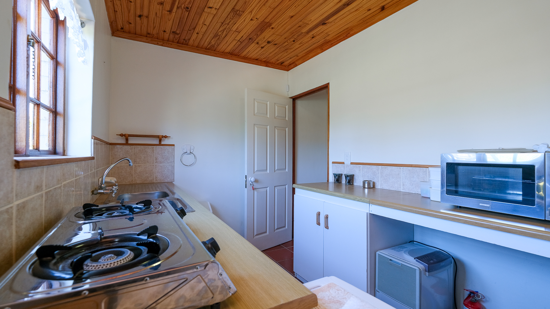 Kitchenette – Leads off the TV lounge. Fridge/freezer, gas stove top, microwave and washing machine. The door opens onto the back patio with a washing line.