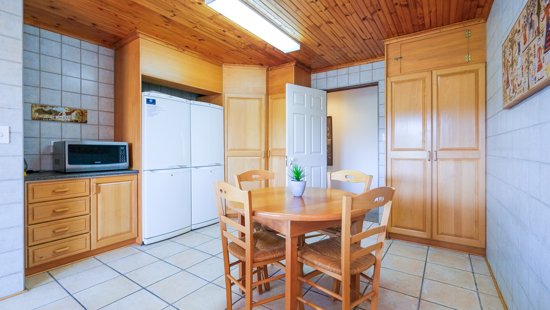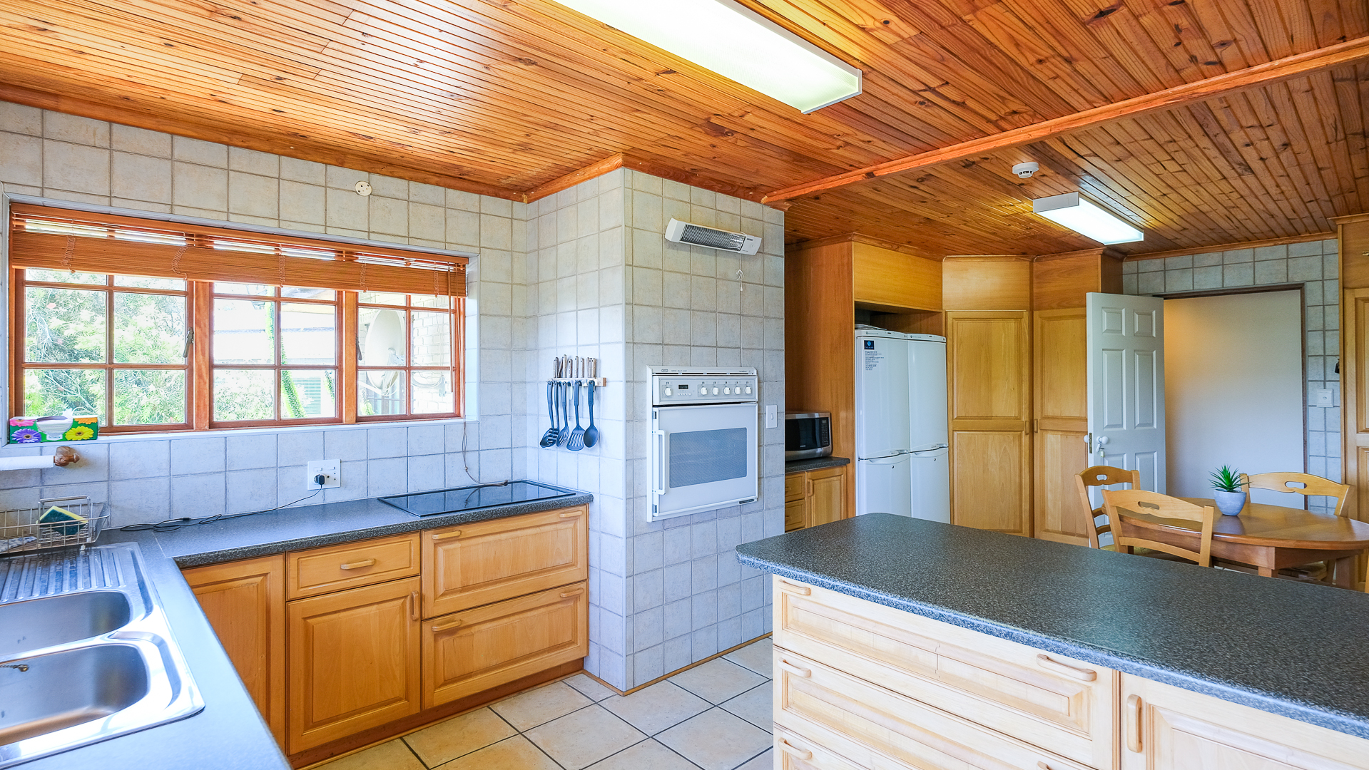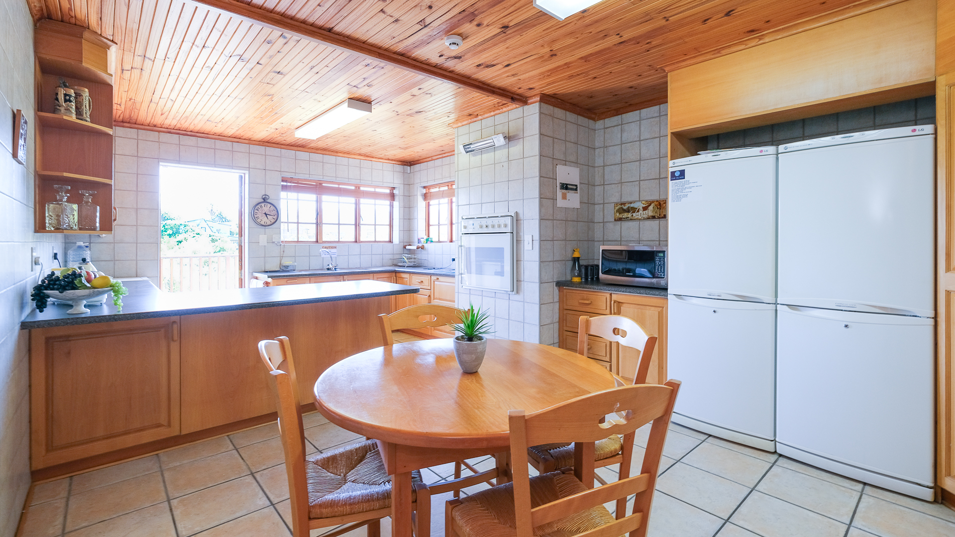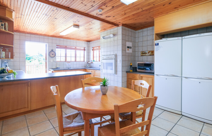 Kitchen – Double door fridge/freezer, built-in stove and oven, microwave, pantry, additional bar fridge and 4-seater dining table. The door opens onto an outdoor wooden deck.