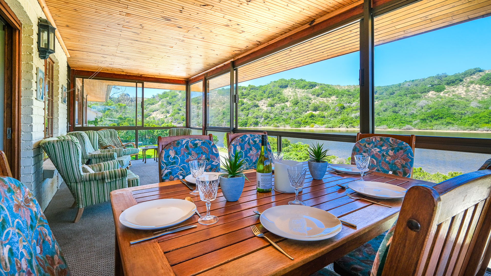Sunroom – Leads off the lounge. Comfortable seating arrangements. 6-Seater dining table. Full lagoon views.