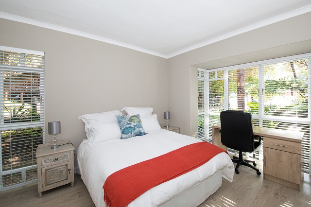 2nd Bedroom: Queen size bed. Ample cupboard space. Desk. Garden views. Portable heater/fan.