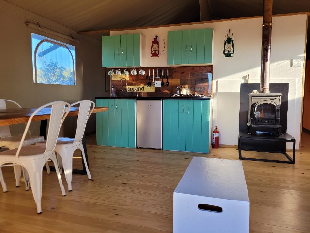 The tents are spacious, clean and very neat. There is a fully equipped kitchenette with all the basics for a most comfortable self-catering stay including a bar fridge, microwave and gas stove top. Every tent offers aircon, electric blankets and a wood-burning indoor fireplace, making it a year-around destination. During the Winter months, cozy up next to the fireplace with views of snowcapped Swartberg mountains in the distance; during the Summer months, keep cool with the assistance of the aircon and dips in the swimming pools nearby.